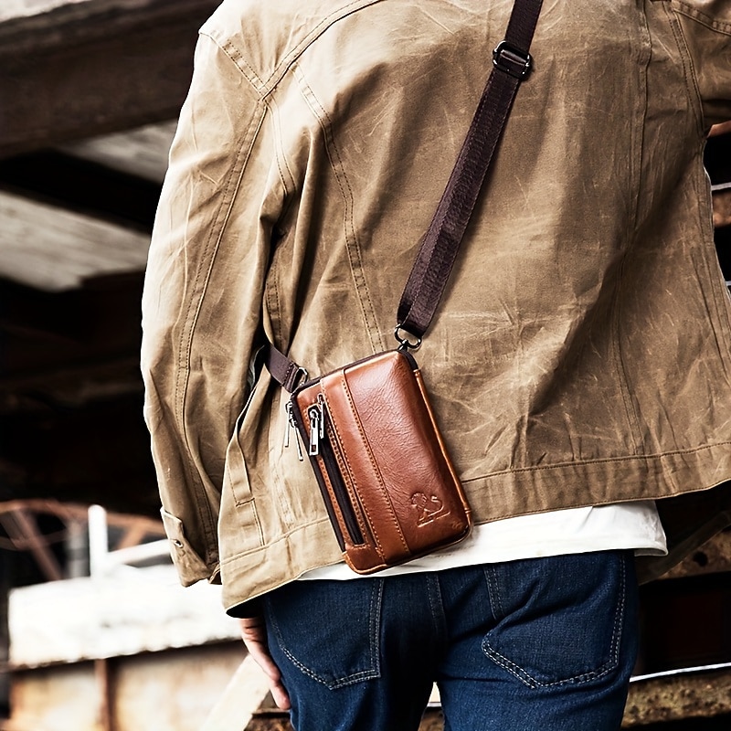 Sleek Brown Leather Vertical Sling Bag - Compact Men's Crossbody Bag with Multiple Zippered Pockets, Ideal for Daily Use and Travel 12