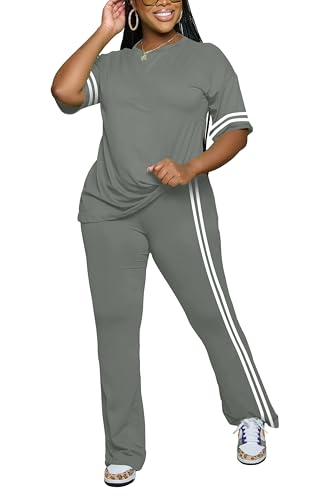 Women's 2 Piece Outfits Crewneck Short Sleeve Tops and Flare Pants Lounge Sets Tracksuit Grey XL 2