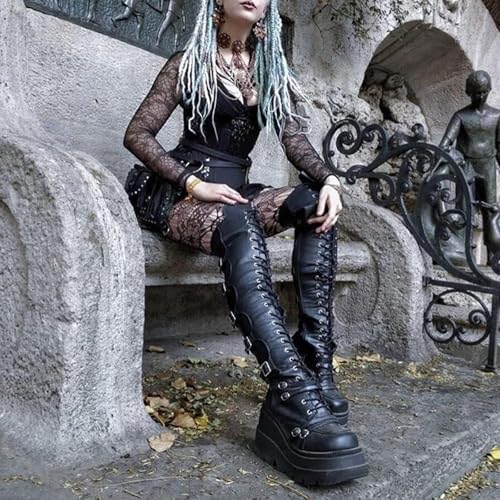 SACFOF Womens Platform Over The Knee Wedges Chunky Booties Winter Buckles Long Boots Motorcycle Punk Goth Combat Boots 1