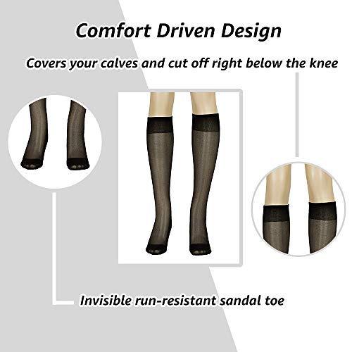 • PERFECT FIT: Well crafted nylon stockings provide sheer coverage. It covers your calves and cut off right below the knee. These colored sheer knee high stockings features an invisible run-resistant sandal toe for added comfort.
