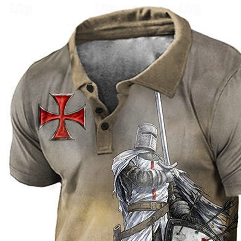 Men's Knights Templar Polo Shirts Golf Shirt Short Sleeve Polo Shirts Collared Shirts Vintage Casual Vacation Wear Festival Wear Party Outfits Buttons 3D Print Blue Brown Coffee