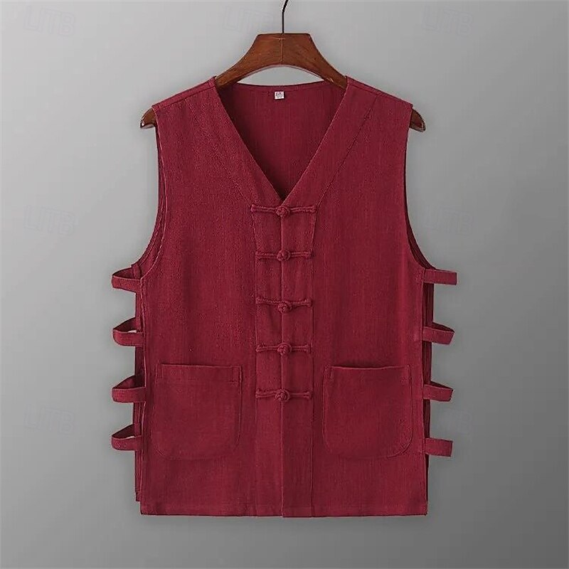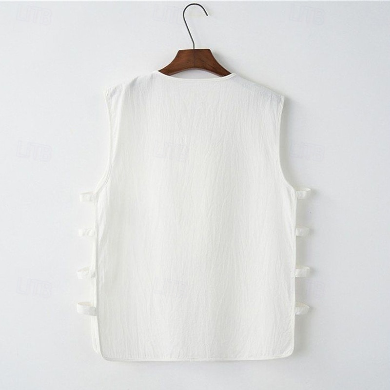 Highlights - Perfect for summer vacation - Made with lightweight and breathable polyester fabric - Sleeveless design for added comfort - Features a stylish V neck and button detailing - Suitable for men looking for a basic yet chic Chinoiserie style outfit