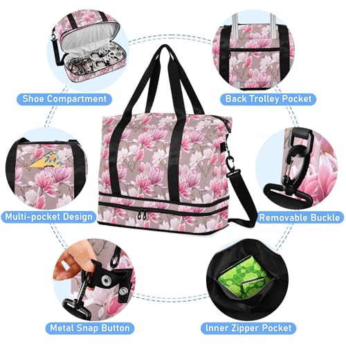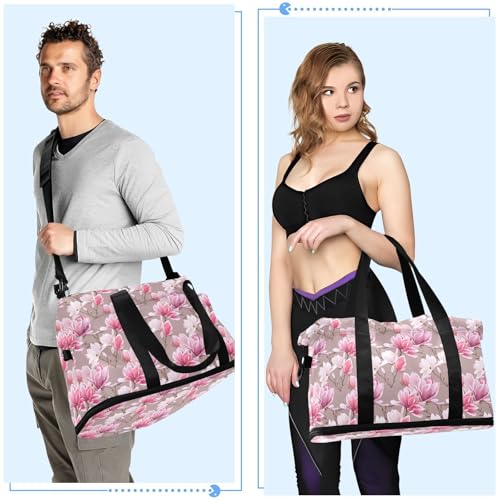 HOT ! Magnolia Flower Blossom Pink Travel Duffel Bag for Women Men Gym Bag with Shoe Compartment Wet Pocket Carry On Weekender Overnight Bags for Travel Weekend Getaway