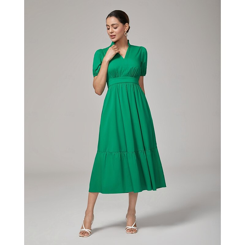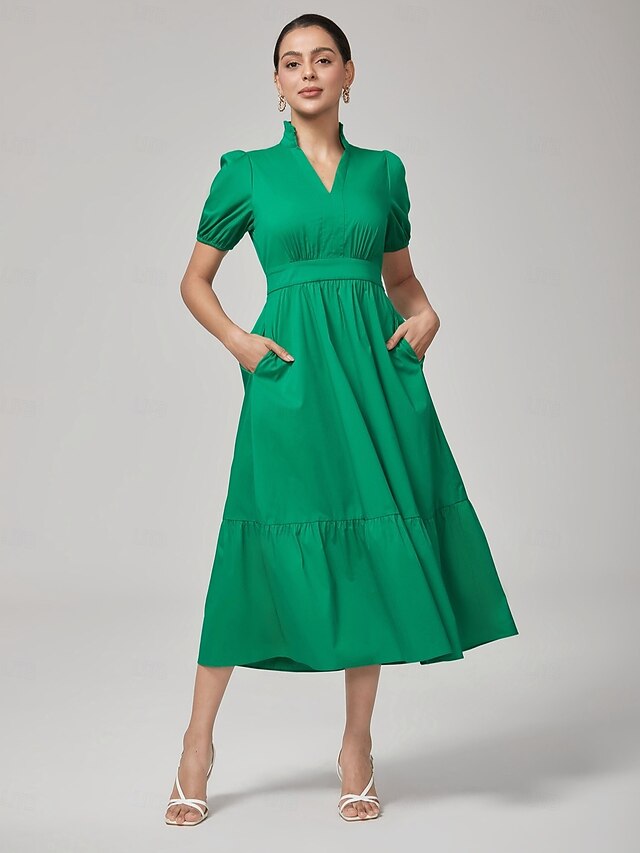 HOT ! Deep Moss Green Cotton Puff Sleeve Dress