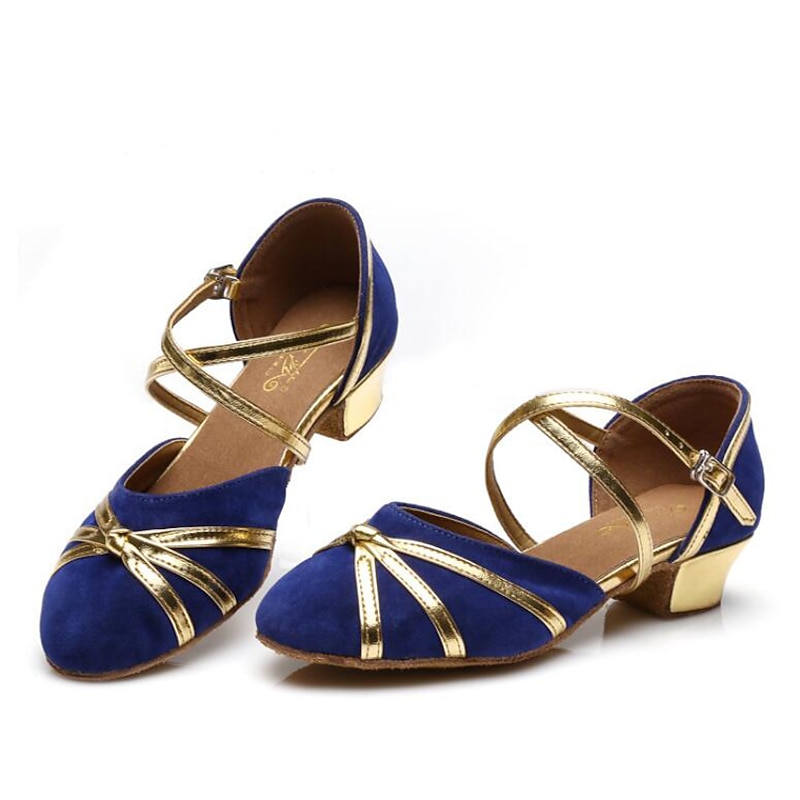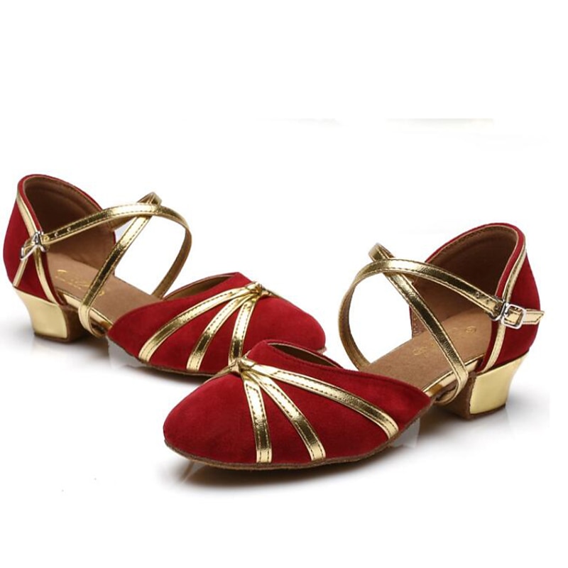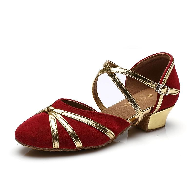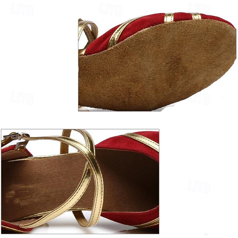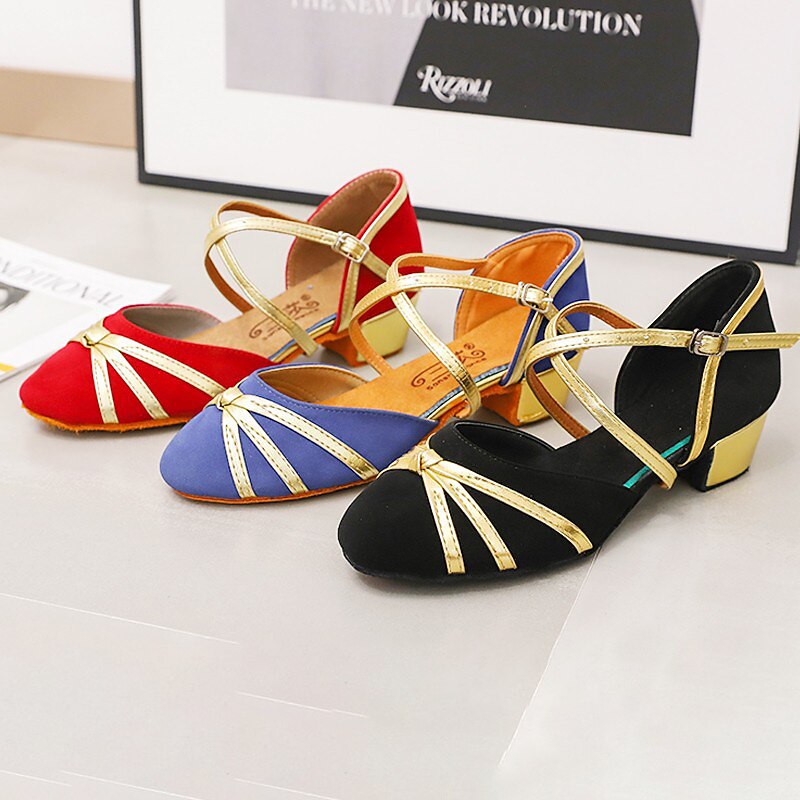 Highlights [Fabric] : Expertly crafted from soft fleece for the upper materials, these ballroom dance shoes offer both a luxurious texture and durability. The suede outsole ensures smooth gliding on the dance floor, perfect for indoor practice and waltz routines. [Design] : The shoes boast a sophisticated thick heel with a height of 1.38 inches (3.5cm), providing stability and comfort for extended wear. Available in timeless black, striking red, and elegant blue, these shoes feature cross straps with gold metallic embellishments for a secure and stylish fit. [Design Highlights] : The cross strap design incorporates adjustable buckles, ensuring a customizable and snug fit. The sophisticated use of contrasting materials enhances their visual appeal, making these shoes a stylish choice for dancers. [Occasions] : Perfect for ballroom dancing, waltz, and indoor practice sessions, these shoes are ideal for both professional dancers and dance enthusiasts. Their elegant yet functional design makes them suitable for various dance events and casual settings. [Size Range] : The shoes are available in a range of sizes to accommodate different fits, including US sizes from 5 to 9, with corresponding EU and UK sizes. Suitable for dancers seeking both style and functionality.