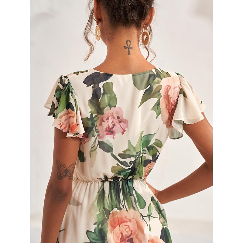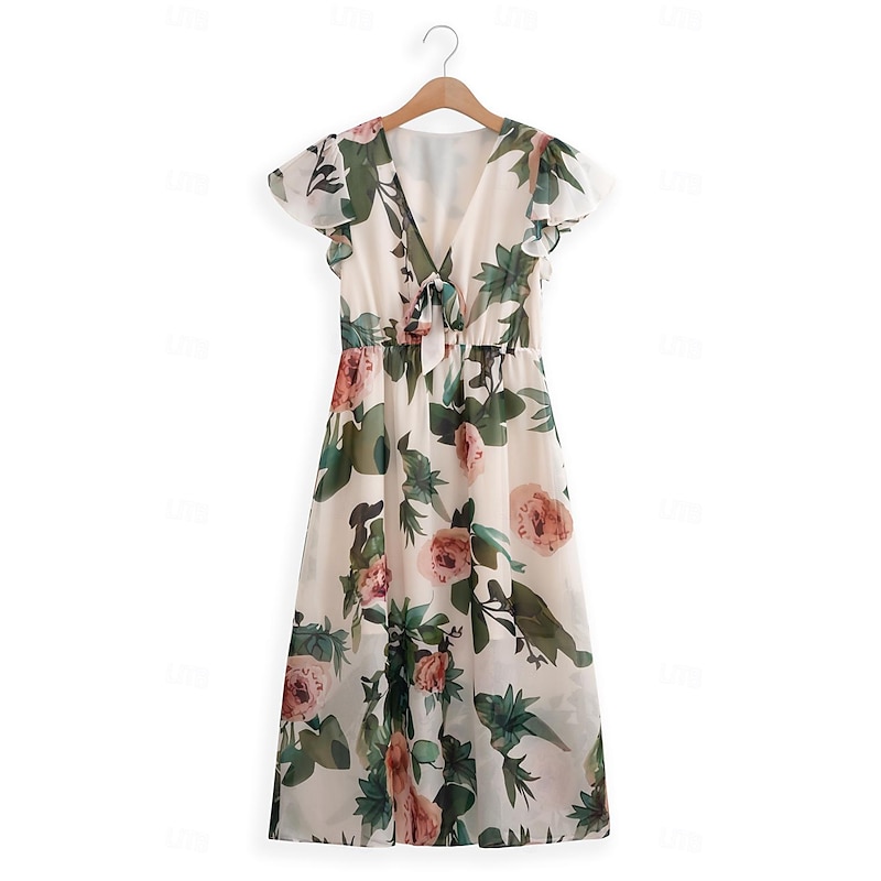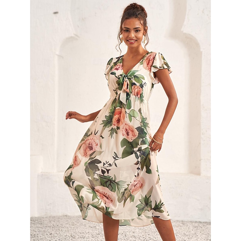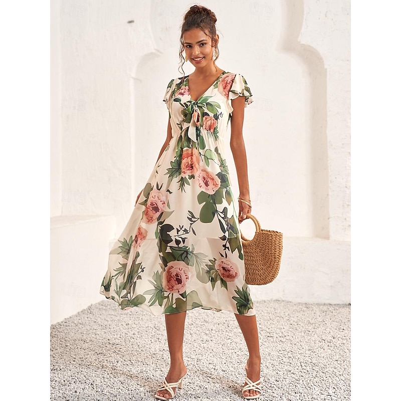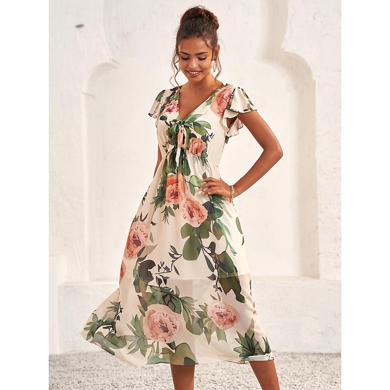 HOT ! Women's Midi Dress Floral V-Neck A-Line Flutter Sleeve Rose Pattern Lightweight Summer Garden Party Wedding Guest Brunch Flowy Feminine White Pink Green