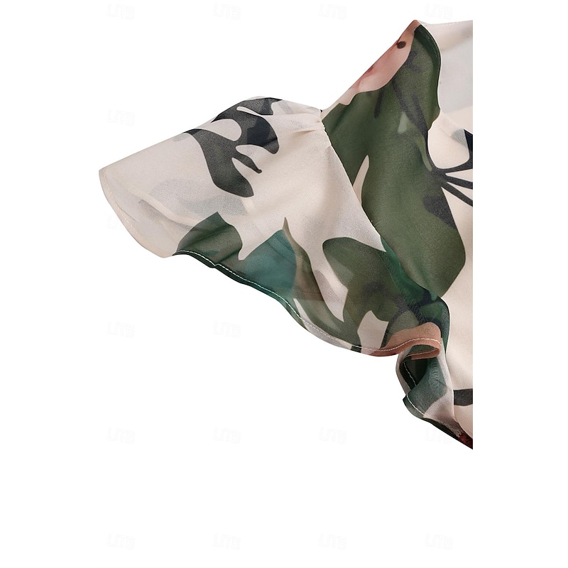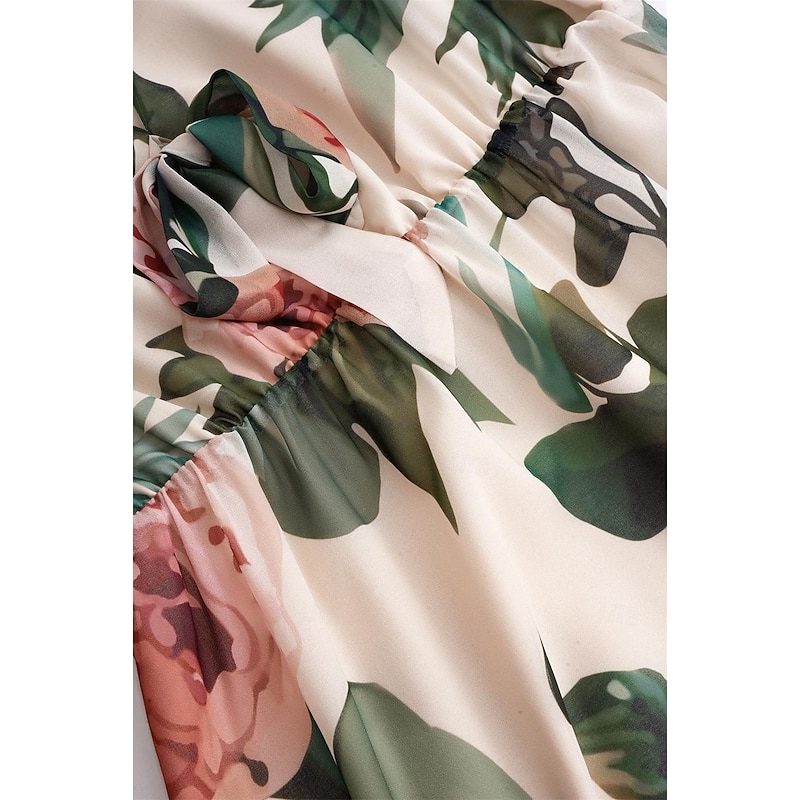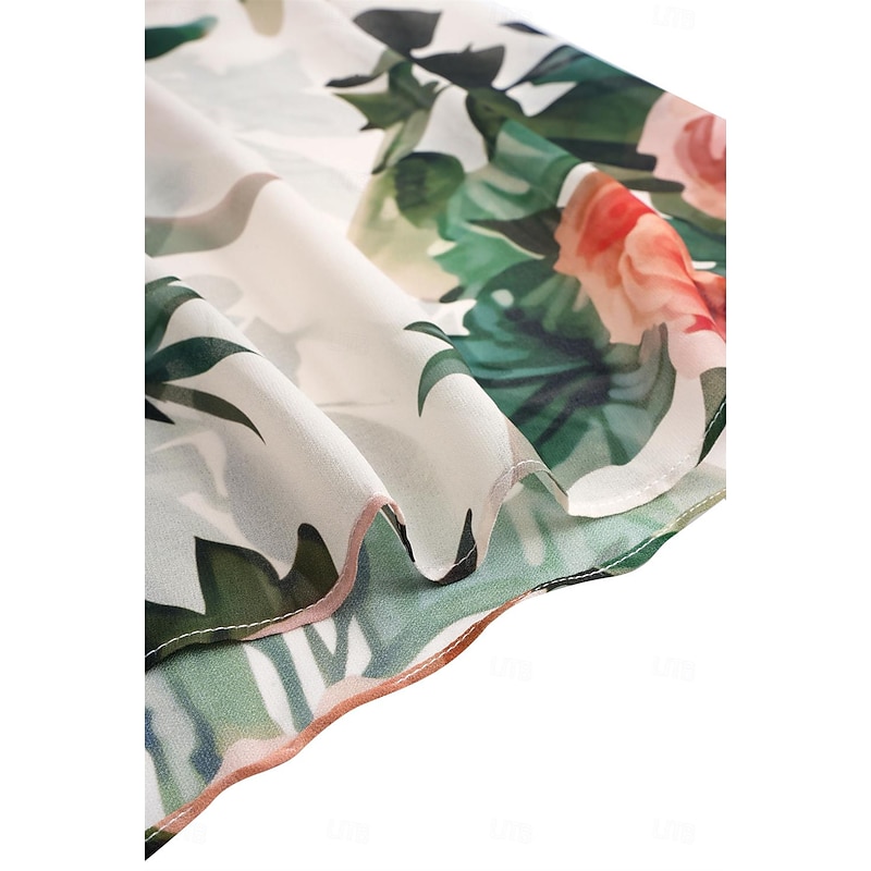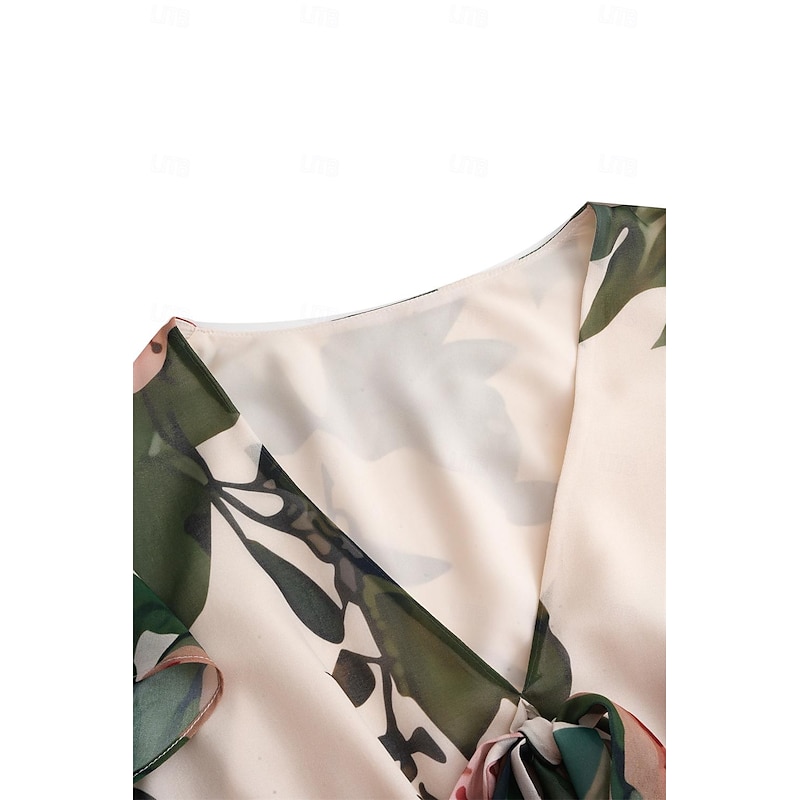 Highlights [Fabric] Crafted from lightweight chiffon, this dress offers a soft and airy feel, perfect for keeping cool on warm summer days. The fabric’s delicate drape enhances its elegant appeal, making it a preferred choice for both comfort and style. [Fit] Designed in a flattering A-line silhouette, the dress provides a regular fit that complements a variety of body types. The midi length ensures a tasteful balance between modesty and modern fashion sensibilities. [Design Highlights] The V-neckline features a chic tie-front detail that adds a retro touch, while short flounce sleeves enhance its feminine charm. A fitted waist subtly highlights your natural silhouette, and the vibrant floral print with pink and green blooms adds an uplifting splash of color. [Occasions] Perfect for cocktail parties, vacations, weddings, or as a wedding guest dress, this piece effortlessly combines casual elegance with sophistication. Its versatile design makes it suitable for a wide range of events, from garden parties to summer outings. [Size Range] Available in sizes S, M, L, XL, and XXL, this dress caters to various preferences, ensuring that every woman can find her perfect fit for any summer occasion.