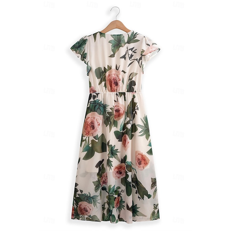 Women's Midi Dress Floral V-Neck A-Line Flutter Sleeve Rose Pattern Lightweight Summer Garden Party Wedding Guest Brunch Flowy Feminine White Pink Green 1