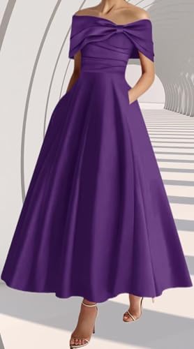 • Features: This off the shoulder Mother of The Bride Dresses, large bow decorations on the shoulders, adding an elegant and romantic touch; equipped with pockets, combining beauty and practicality. Made of satin material, it has a smooth texture and luster, giving it an upscale look. The tea length design makes it elegant and decent.