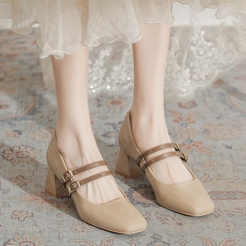 Women's Leather Chunky Low Heel Mary Jane High Heels Retro Square Toe Double Ankle Strap Non-Slip Low Thick Heel Work Wedding Formal Dress High Heels 7