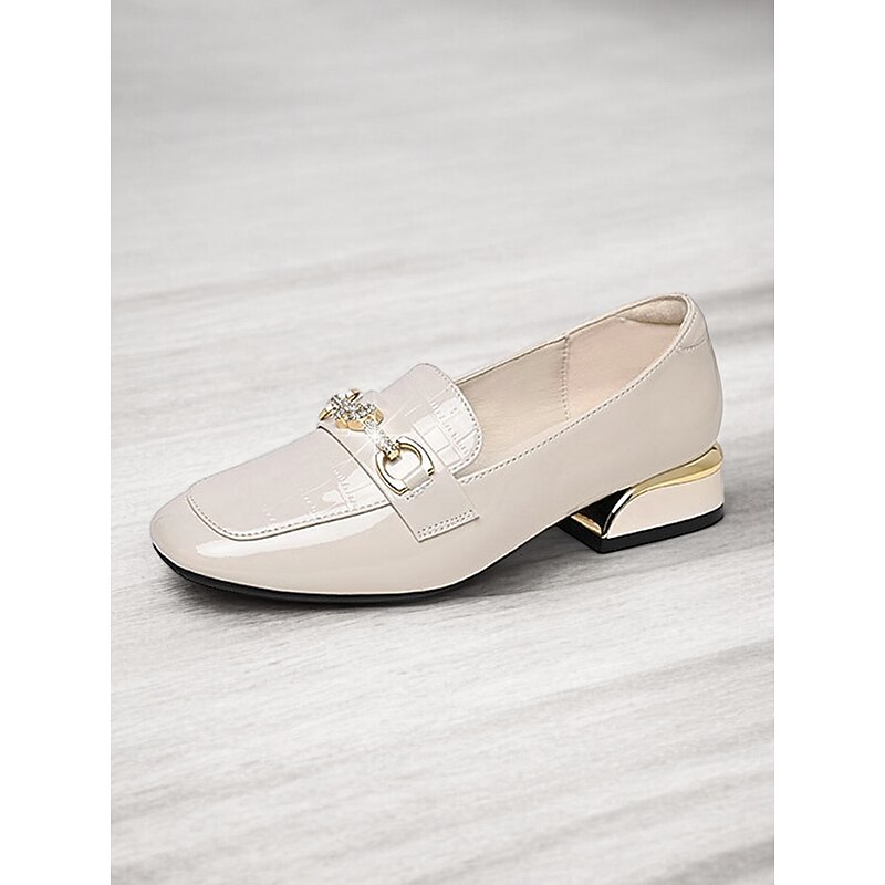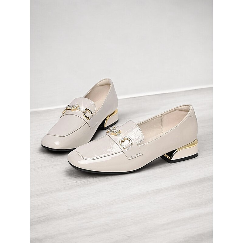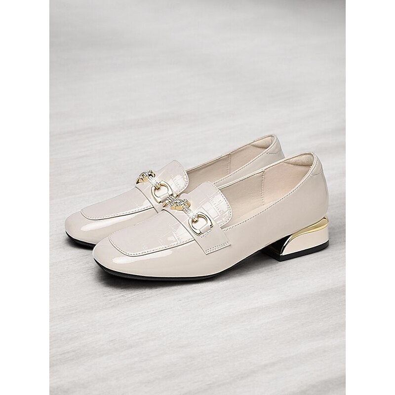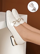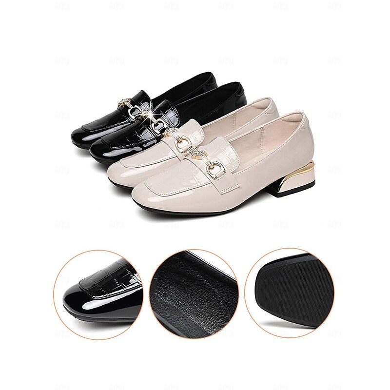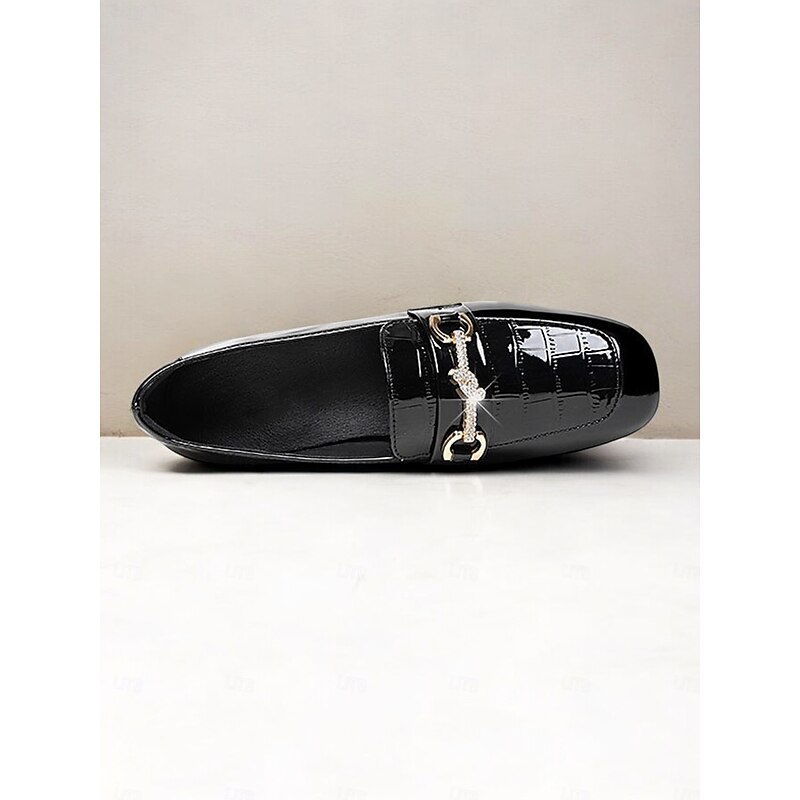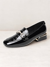 Highlights [Product Title:] Women's Patent Leather Loafers - Sleek Glossy Finish with Gold Buckle, Elegant Flat Shoes for Casual and Formal Wear [Fabric:] Crafted from high-quality patent leather, these loafers feature a sleek and glossy finish, providing a sophisticated and polished appearance. The durable and refined construction ensures long-lasting comfort and style. [Fit:] These loafers boast a classic design with a modern twist. The low block heel offers subtle elevation and comfort for prolonged wear, making them ideal for both casual and formal settings. [Design Highlights:] A standout feature of these loafers is the decorative metal buckle adorned with subtle rhinestones, adding a touch of glamour. The slightly squared toe cap adds a contemporary flare, blending traditional elements with modern elegance. [Occasions:] Perfect for a stylish day at the office, formal occasions, or any casual event where sophistication is desired. Whether worn for business meetings or leisurely outings, these loafers complement a variety of settings with their chic and timeless design. [Size Range:] Available in a range of sizes to cater to a variety of preferences, from US5.5 to US9.5-10, ensuring an ideal fit for different foot shapes and personal style choices.