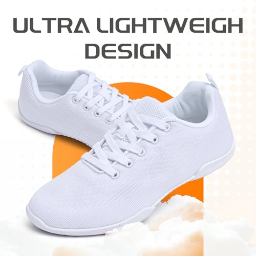 • 【Ultra-Lightweight & Breathable】The White cheer shoes utilize a Jacquard upper for durable and intensity. provide for safety and slip-resistant. Breathable mesh in the upper are also designed to help manage heat and swelling. Integrated lacing system with breathable comfort lining for comfortable foot flex.
