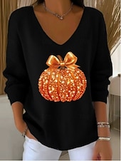 More information about Halloween Women's Sweater Casual Soft Ribbed V Neck Knitted Long Sleeve Regular Tops Knit Outdoor Daily Black Orange Fall Winter