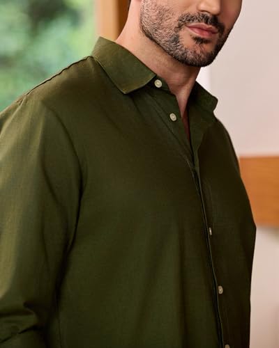 • Natural Linen Cotton Blend – Made with 30% linen and 70% cotton, this men’s button down shirt delivers breathable comfort, combining the crisp texture of linen with the softness of cotton for lightweight wear.