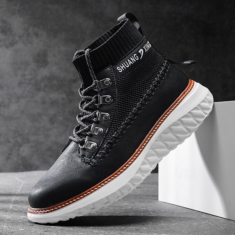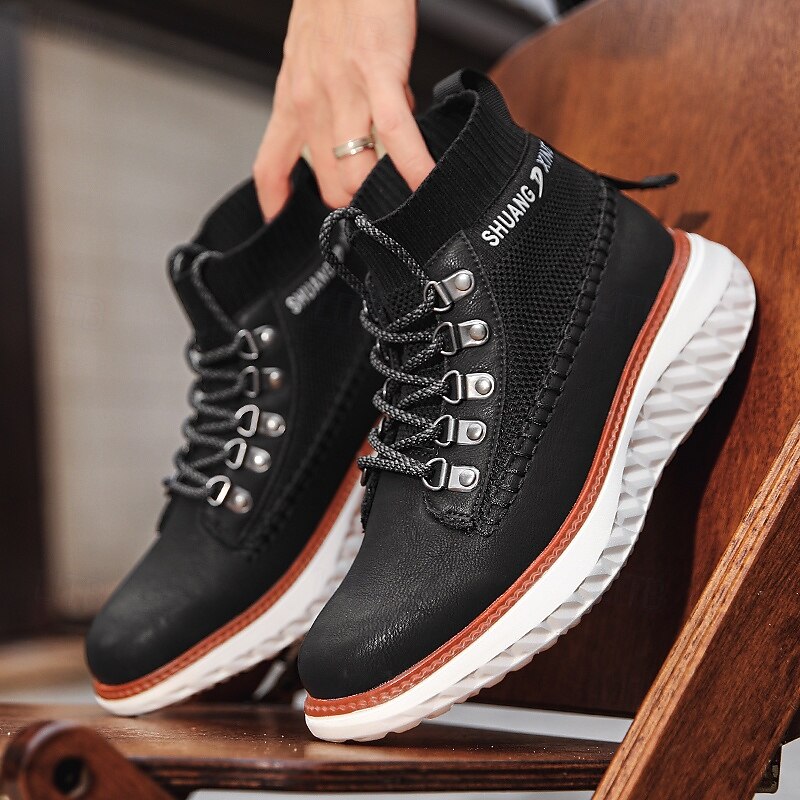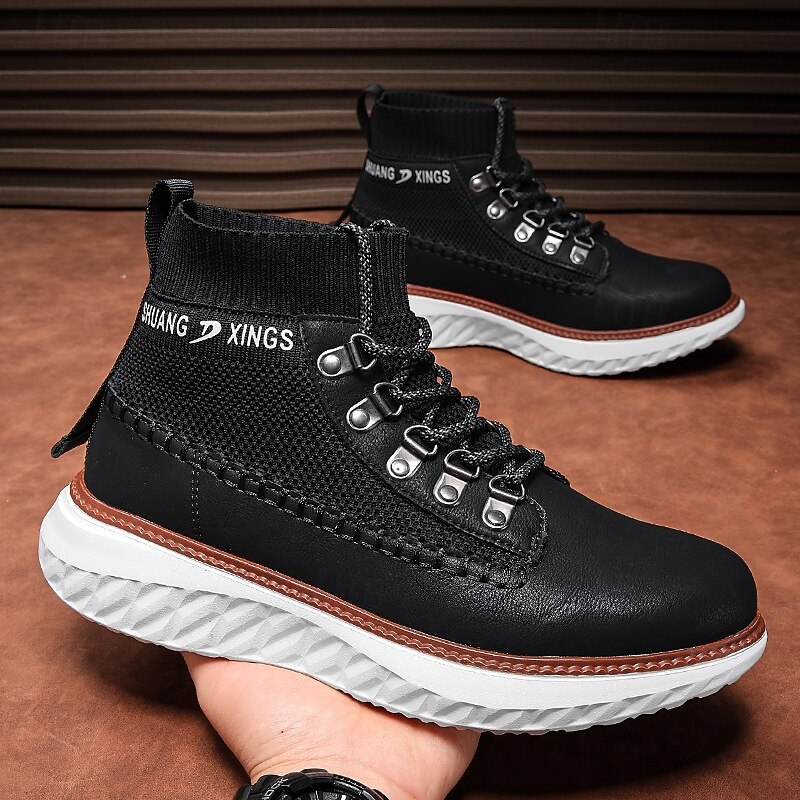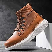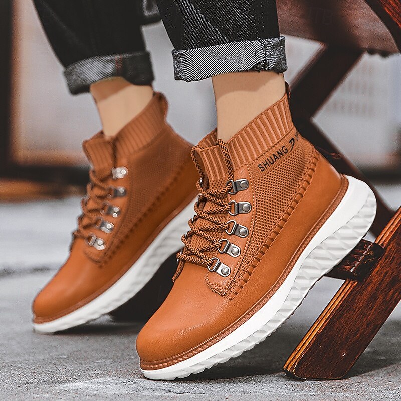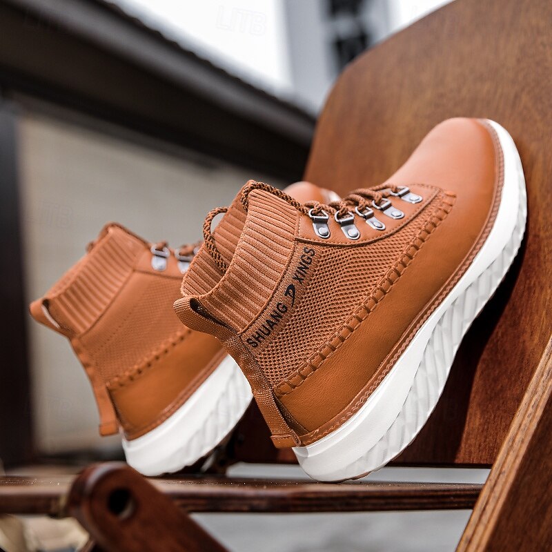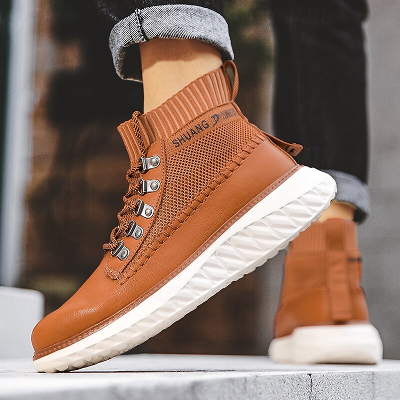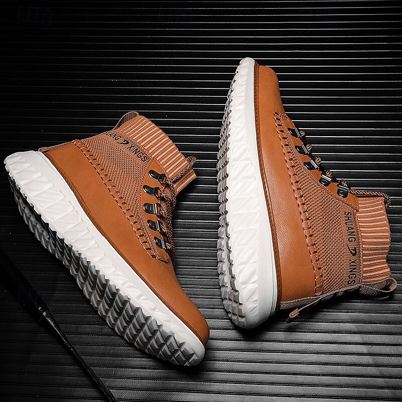 More information about Men's Brown Faux Leather High-Top Sneakers with Knitted Ankle Design – Comfortable Lace-Up Casual Boots for Fall, Winter and Outdoor Streetwear