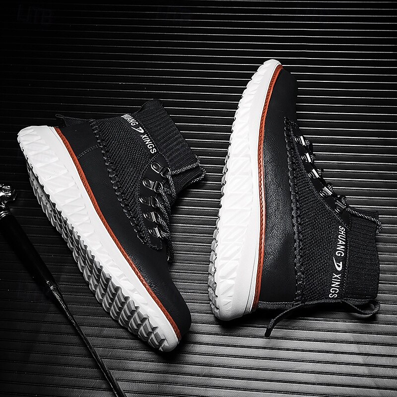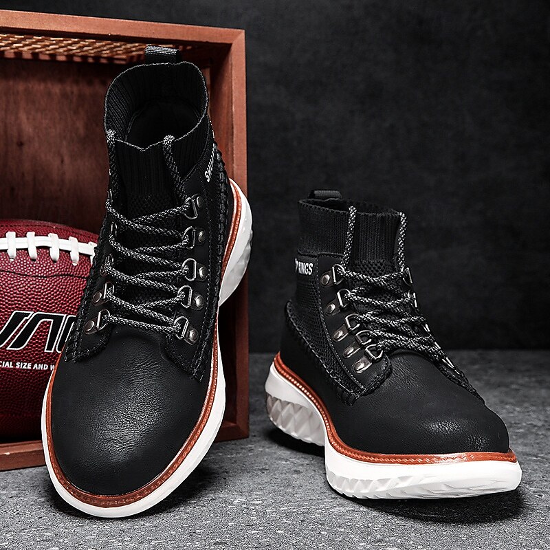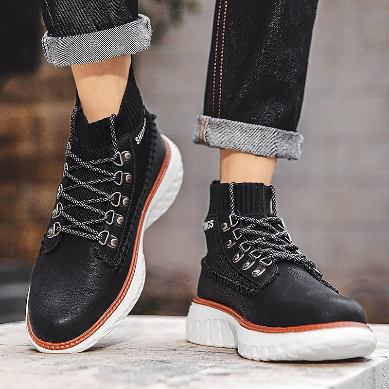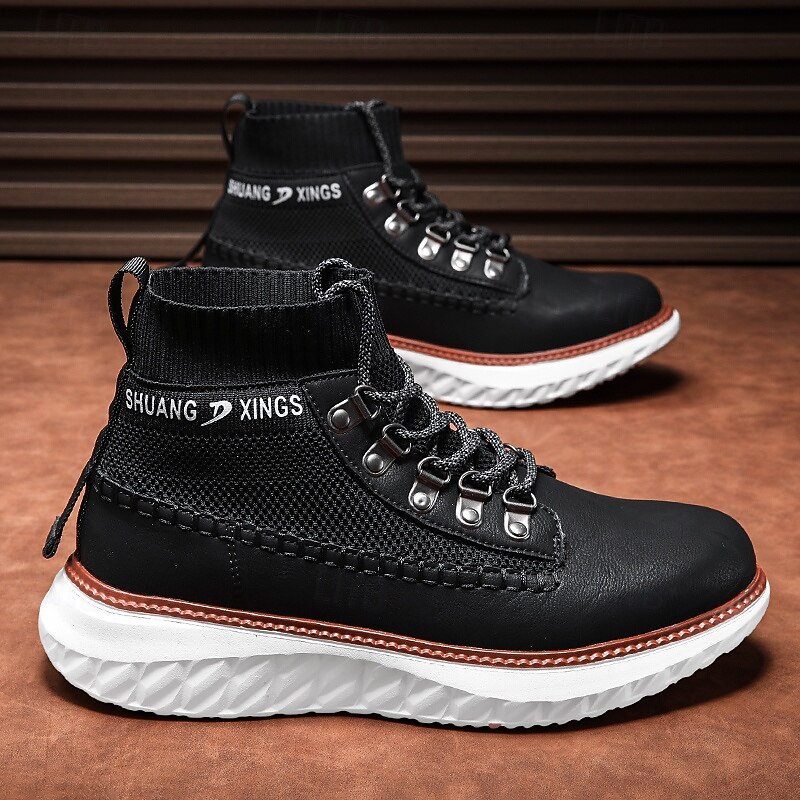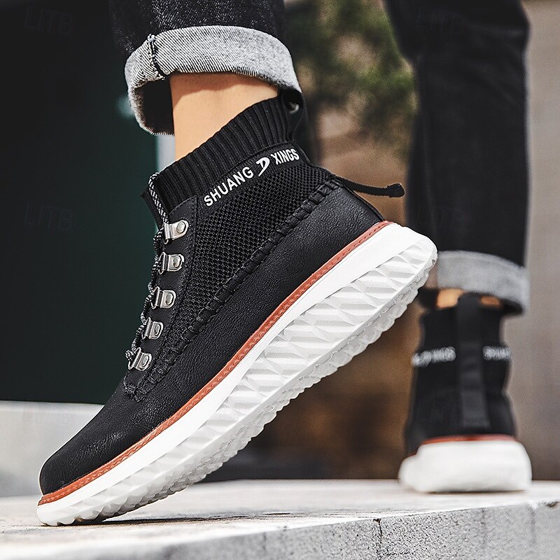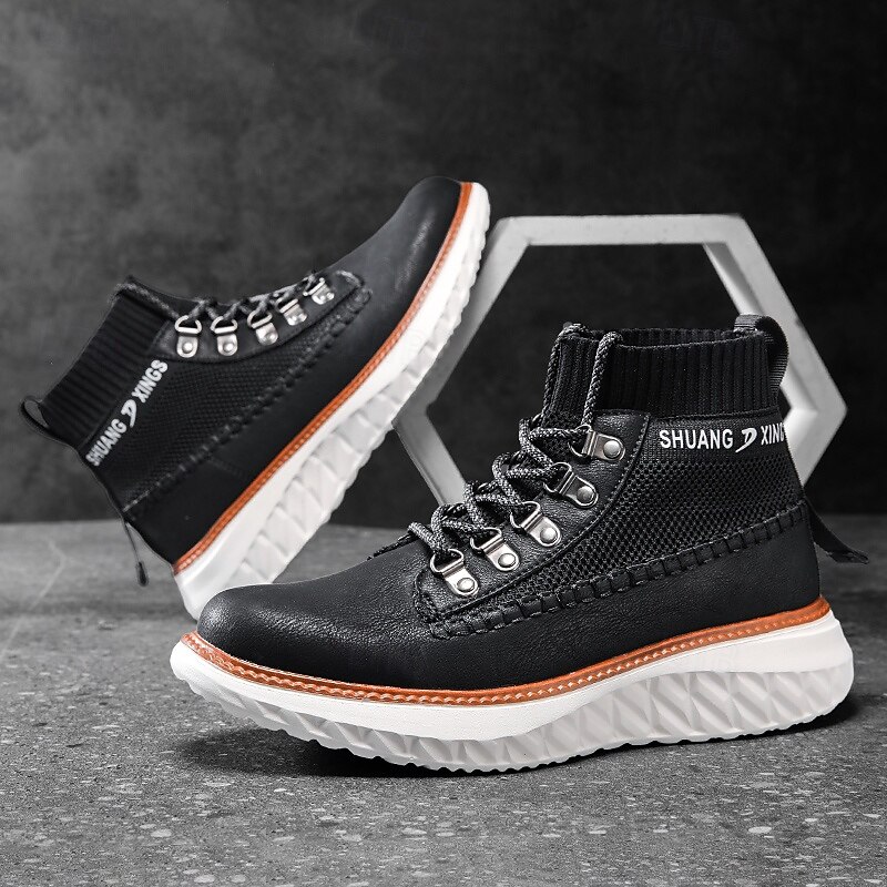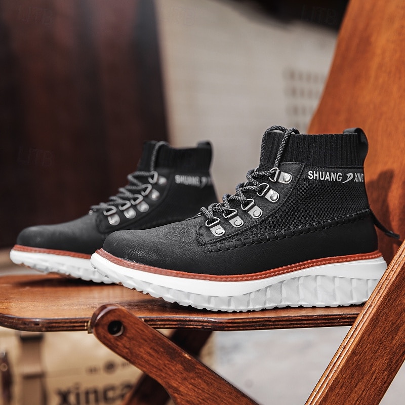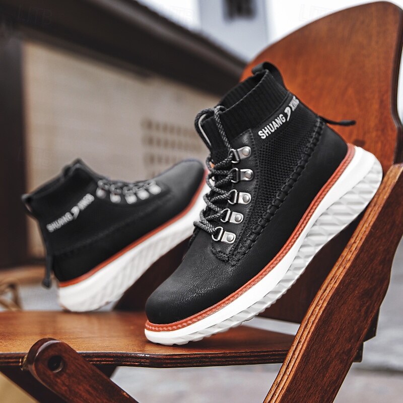 More information about Men's Brown Faux Leather High-Top Sneakers with Knitted Ankle Design – Comfortable Lace-Up Casual Boots for Fall, Winter and Outdoor Streetwear