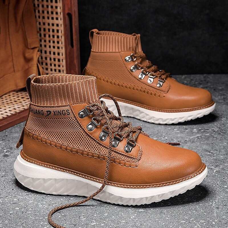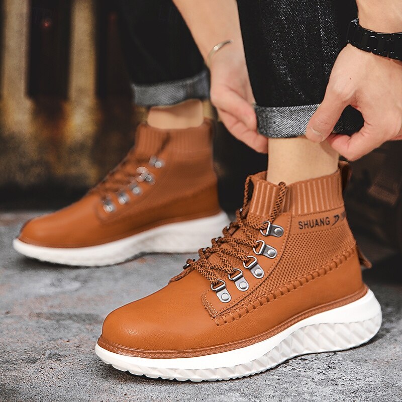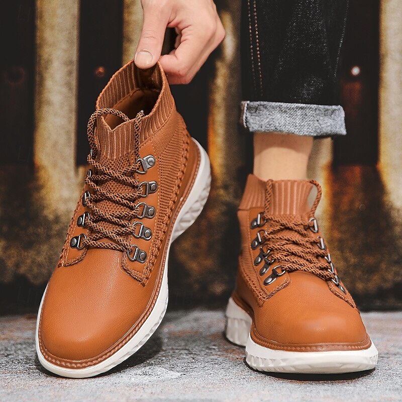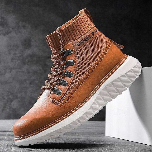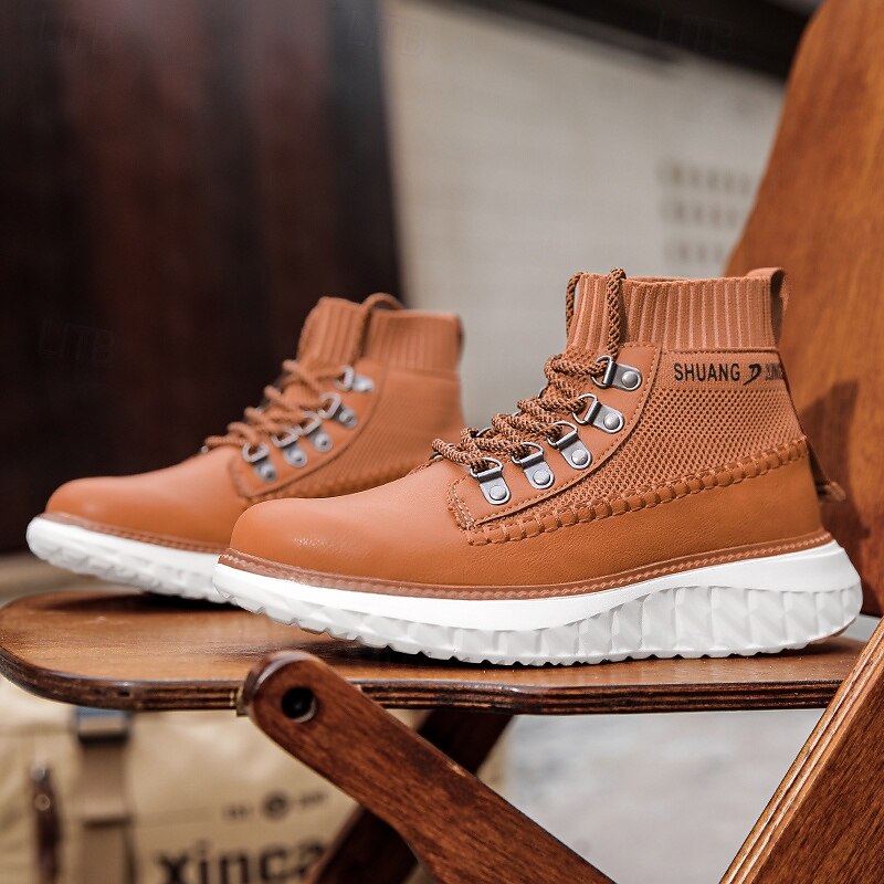 HOT ! Men's Brown Faux Leather High-Top Sneakers with Knitted Ankle Design – Comfortable Lace-Up Casual Boots for Fall, Winter and Outdoor Streetwear