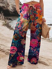 More information about Women's Wide Leg Pants Trousers Vacation Casual Long High Waist Floral Elastic Waist Printing High Cut Breathability Soft Micro-elastic Vacation Street Daily Wear Red Green Spring Fall Regular Fit