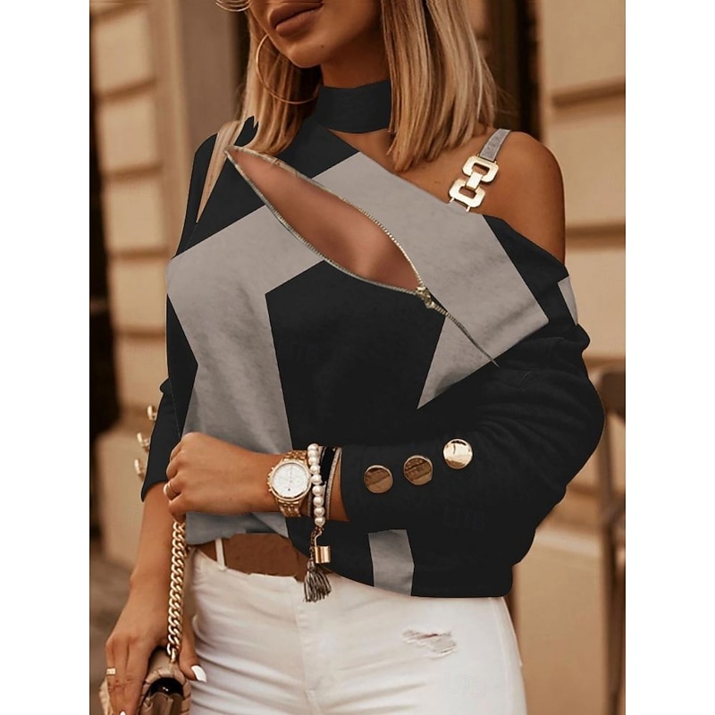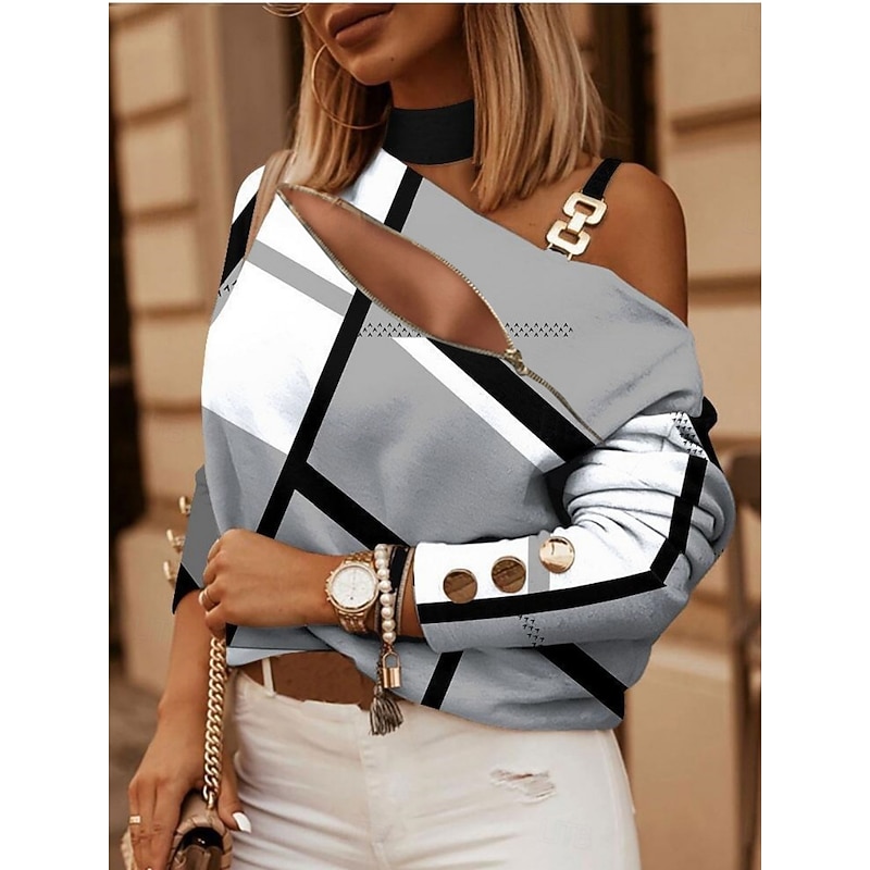 Women's Shirt Blouse Geometric Stylish Casual Long Sleeve Asymmetrical Regular Tops Daily Patchwork Print White Navy Blue Khaki Gray Summer Spring 2