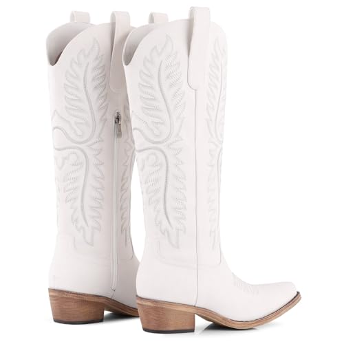 FancyQueen Cowboy Boots for Women Western Heel Cowgirl Boots Women Wide Calf Zipper Western Classic Embroidered Pointed Toe Knee High 6