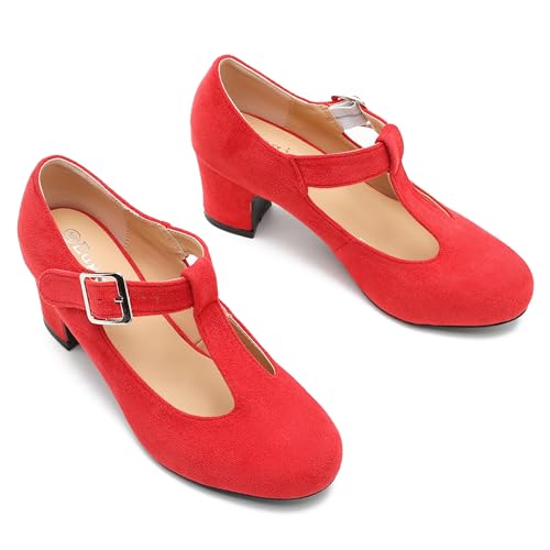 More information about Women's T-Strap Mary Jane Pumps Round Closed Toe Comfortable Low Chunky Block Heel Wedding Dress Evening Party Shoes Red Suede 43-10US