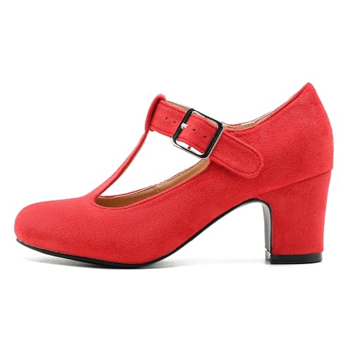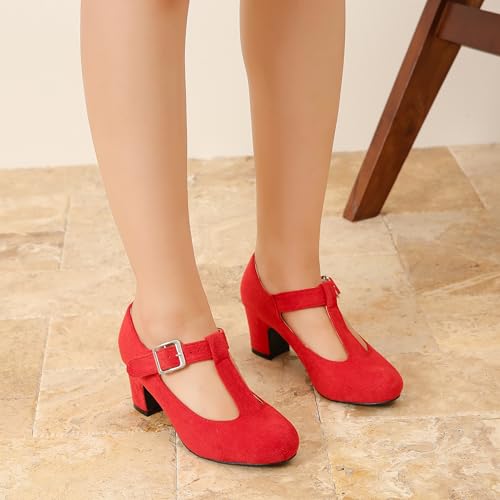 Women's T-Strap Mary Jane Pumps Round Closed Toe Comfortable Low Chunky Block Heel Wedding Dress Evening Party Shoes Red Suede 43-10US 5