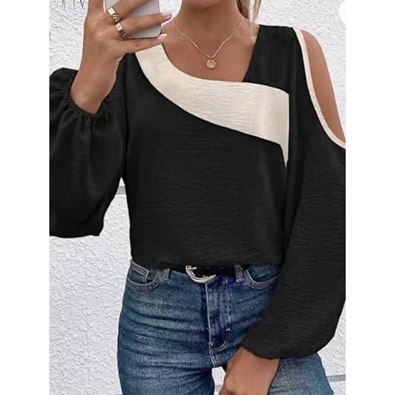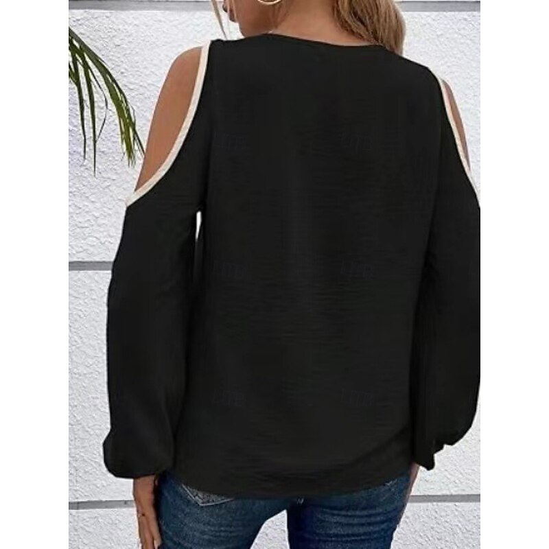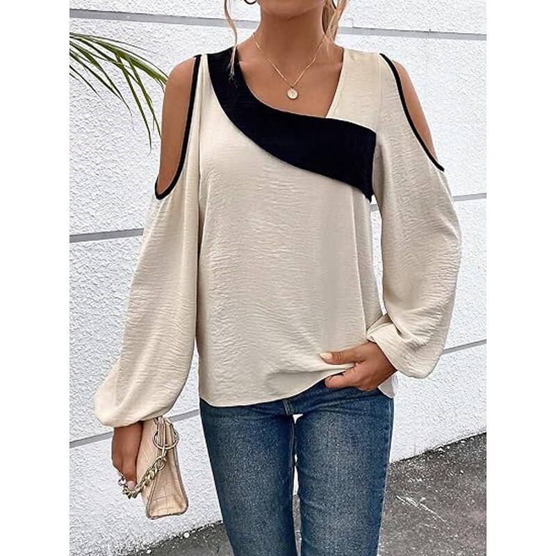 More information about Women's Shirt Blouse Solid Color Basic Casual Long Sleeve V Neck Regular Tops Daily Patchwork Cut Out Black Beige Spring & Fall