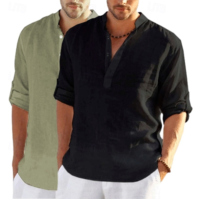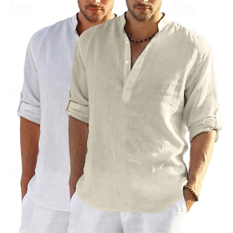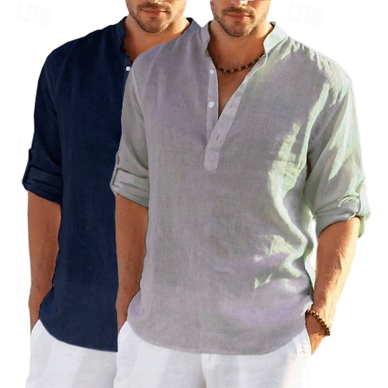 HOT ! Men's Shirt Linen Shirt Band Collar Shirt Popover Shirt Summer Shirt Beach Wear Solid Color Vacation Casual White+khaki Blue+Dark Grey Navy Blue+Grey Blue+Navy Blue Long Sleeve Henley Summer Spring