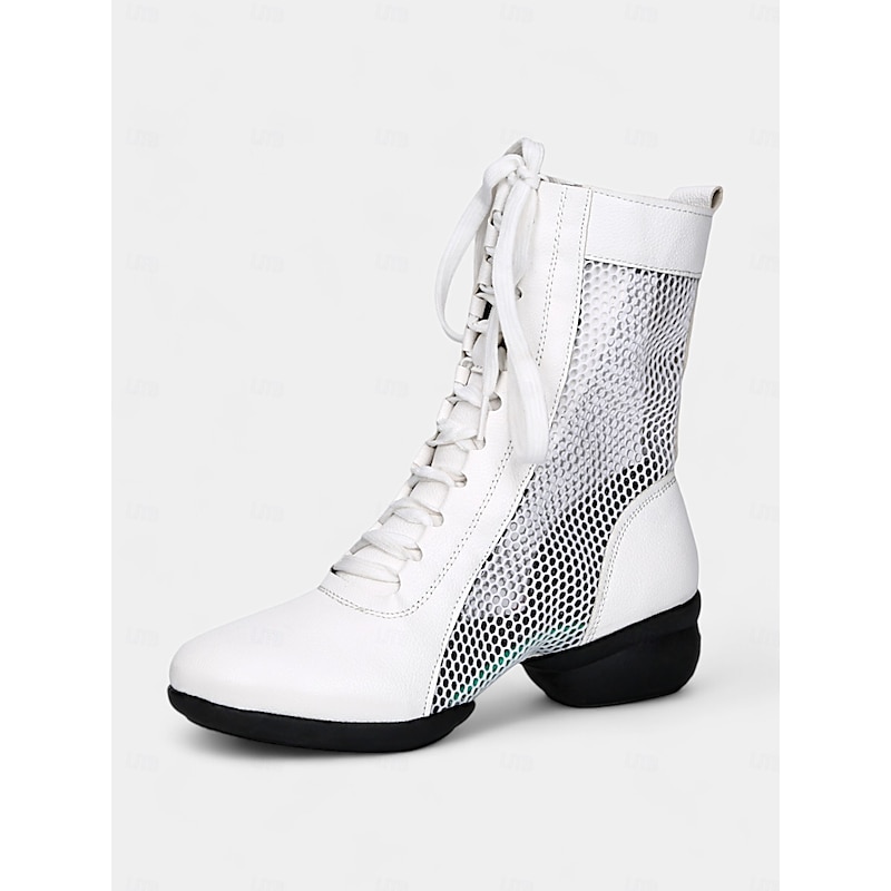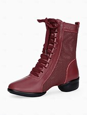 Highlights [Fabric] : Crafted from premium PU leather and tulle, these women's dance boots offer a luxurious yet breathable experience. The combination of materials ensures durability and style, ideal for intense dance performances. [Style] : These ankle boots are designed with a versatile lace-up system paired with a practical side zipper, providing a secure fit and ease of wear. The bold red color adds a vibrant touch, making these boots a standout choice for any dancer. [Design Highlights] : Featuring mesh panels along the sides, these boots not only enhance breathability but add a modern flair to the overall design. The low heel, measuring 1.57 inches, offers stability and comfort for long hours on the dance floor, while the round toe shape maintains elegance. [Occasions] : Perfect for a range of dance events including Samba, Cha-Cha, and Rumba, these boots transition effortlessly from practice to performance. They also suit party or evening events, adding a striking element to both casual and formal attire. [Size] : Available in an array of sizes from US5 to US9.5-10, these boots are designed to accommodate various foot shapes comfortably. We recommend selecting your usual size for the best fit.