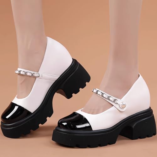 Elegant & Comfort Round-Toe Mary Jane Shoes Women with Metal Chain & Pearl Design Genuine Leather Waterproof Chunky Platform Wedge for Dressy Work 6