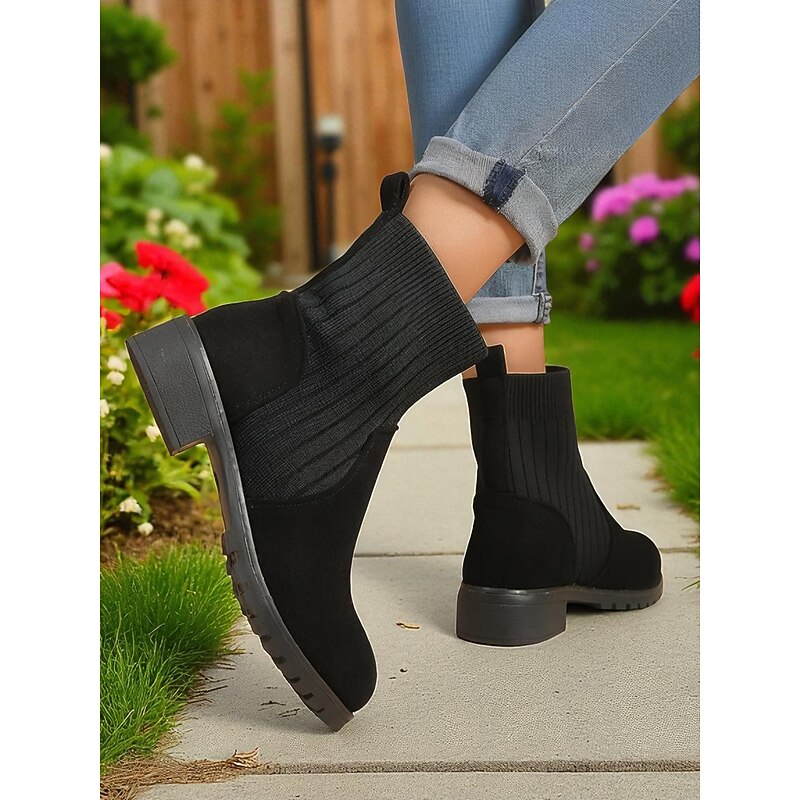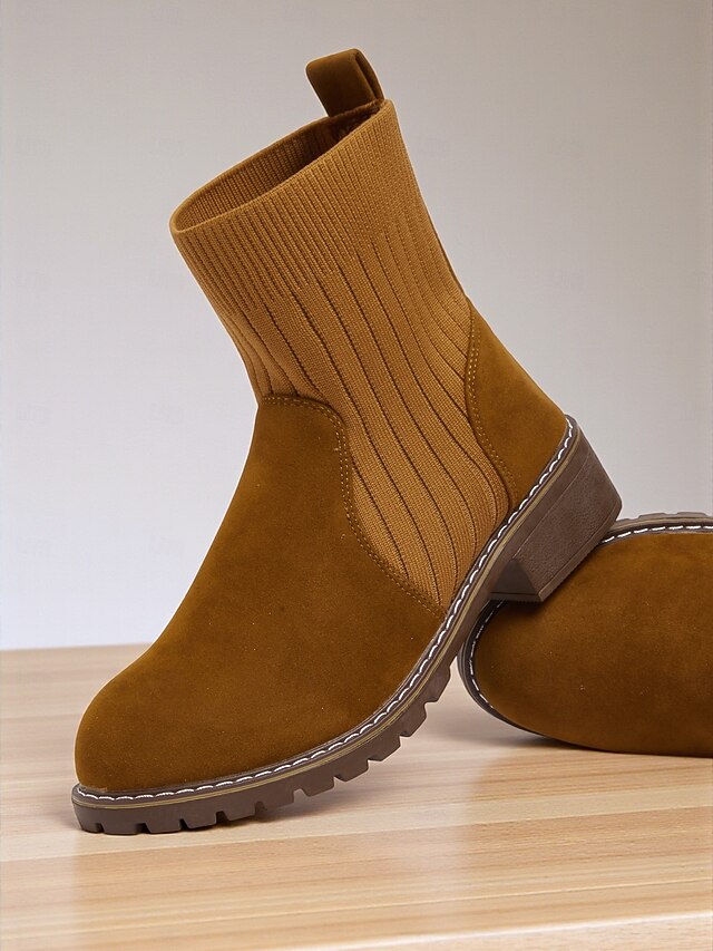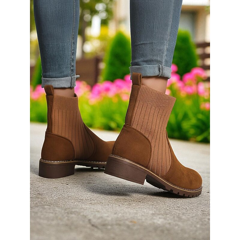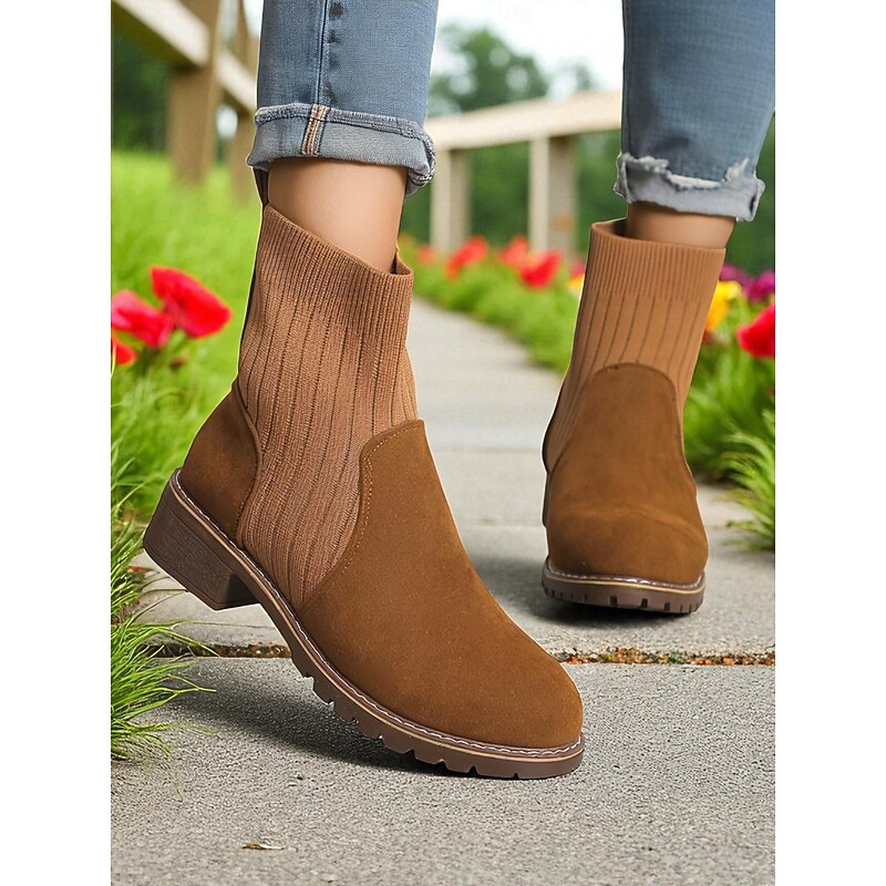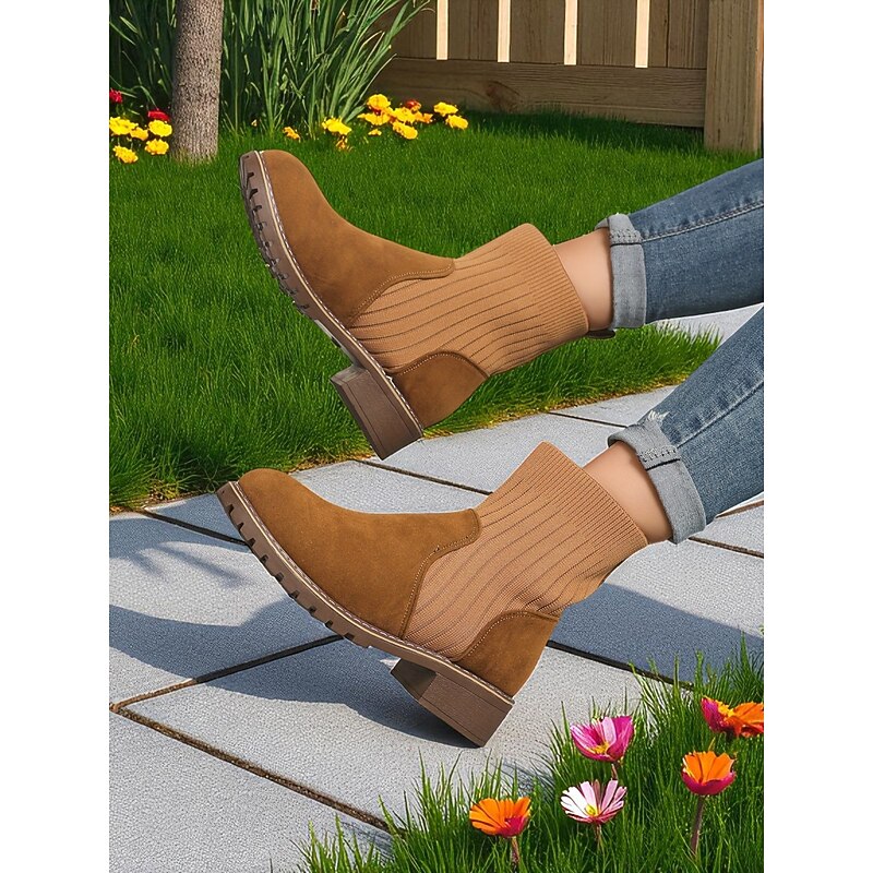 HOT ! Women's Light Brown Faux Suede Ankle Boots with Ribbed Knit Shaft – Cozy Autumn Winter Chelsea Style Boots for Casual Outfits