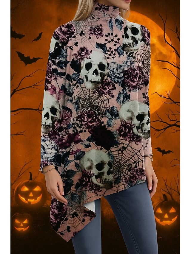 HOT ! Halloween Women's Blouse Floral Graphic Elegant Active Stylish Long Sleeve Turtleneck Regular Tops Party Evening Wear Daily Going out Asymmetric Hem Pink Spring Fall Winter Spring, Fall