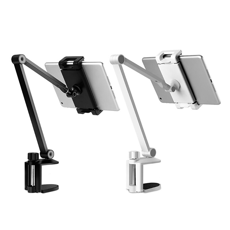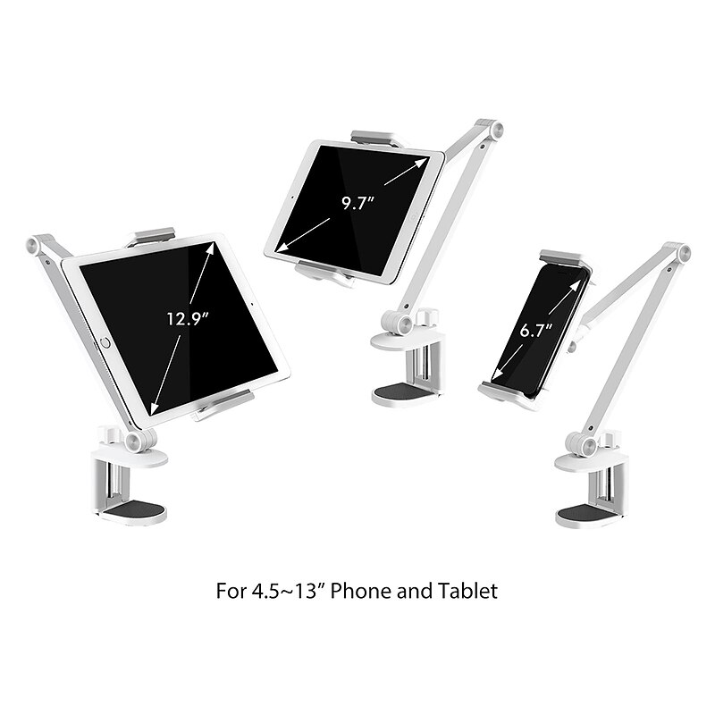 Highlights Introducing the must-have Clip-on Tablet/Phone Holder for an easy and comfortable hands-free viewing experience! This holder is specifically designed to clip onto your tabletop or headboard for a secure and stable grip on your device, making it ideal for watching television shows or cooking lessons in bed or the kitchen. It features adjustable height and any-angle rotation capability, making it the perfect secondary screen for your computer or a great tool for filming your hand movements. Not only is it compatible with almost all phones and tablets ranging from 4.7'' to 13'', but it's also made of high-hardness aluminum alloy, ensuring that it can securely hold up to 1KG of heavy equipment. Additionally, the c-clamp design with its screw locking structure that can fit on desktops within 58mm (2.28'') such as desks, kitchen worktops, headboards, and more. Enjoy the convenience and versatility of the Clip-on Tablet/Phone Holder!