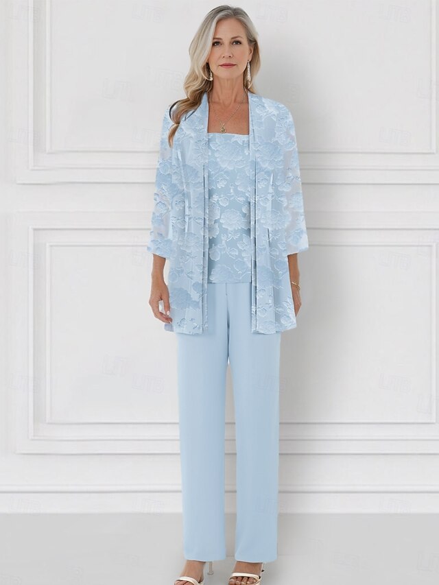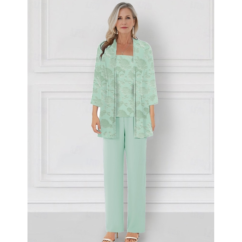More information about Floral Lace Pantsuit 3 Piece Mother of the Bride Pantsuit Elegant Simple Minimalist Crew Neck Floor Length Chiffon 3/4 Length Sleeve with Jacket