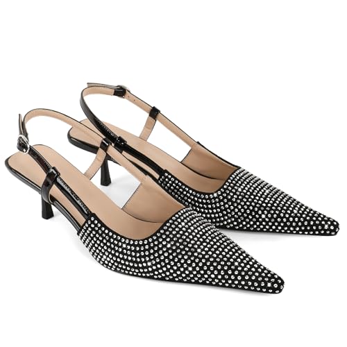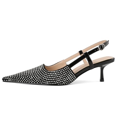 Mettesally Womens Slingback Kitten Heels Low Heel Pumps Pointed Toe Glitter Rhinestone Heels Comfort Evening Shoes 2 Inches 5
