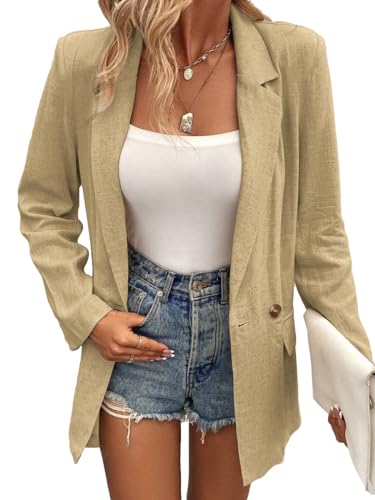 HOT ! Mina Self Summer Womens Linen Blazers Jackets Lightweight 2024 Spring Long Sleeves Business Casual Dressy Office Light Clothes Blazers Suit Jacket for Women, Daily/Work, Khaki Small Size