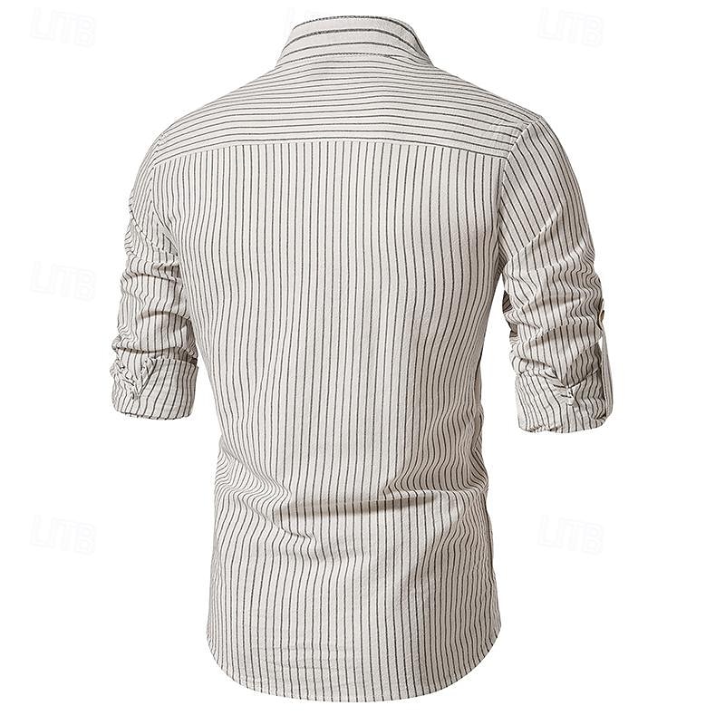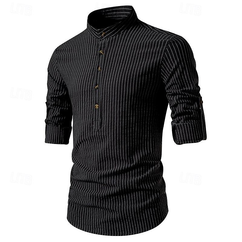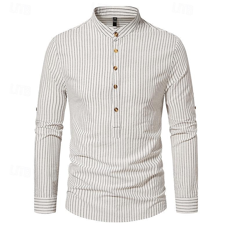 Men's Shirt Chinese Collar Shirt Mandarin Collar Shirt Popover Shirt Casual Shirt Cotton Shirt Striped Vacation Hawaiian Black White Pink Purple Long Sleeve Band Collar Spring &  Fall Clothing Apparel 17