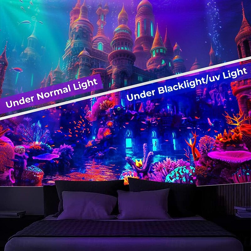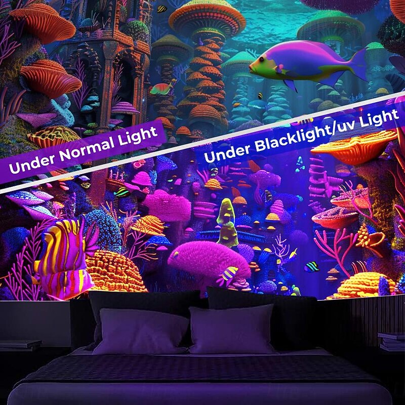 Highlights 【Durable Construction】 Crafted with high-quality polyester fabric, this tapestry is built to last. Its robust composition ensures that you can enjoy its beauty for years to come. 【Soft and Lightweight】 This tapestry is soft to the touch and lightweight, making it perfect for both indoor and outdoor use. 【Multiple Size Options】 Available in different sizes to accommodate any room's dimensions. 【Intricate Design】 The tapestry features a captivating design inspired by life itself. Its vivid imagery, crisp lines, and vibrant colors will become a conversation piece in any room. 【Versatility at Its Best】 Not just for wall decor, this tapestry can also double as a tablecloth or a picnic blanket, adding functional versatility to its artistic charm. 【Note】 1. Please allow 1-2cm (0.4"-0.8") deviations due to manual measurement. 2. Please understand the tiny color vary from the product due to different light and screen display. 3. UV/Black Light Reactive: This glow in the dark tapestry glows under blacklight / UV light. In normal light, the colors also are full and vivid.