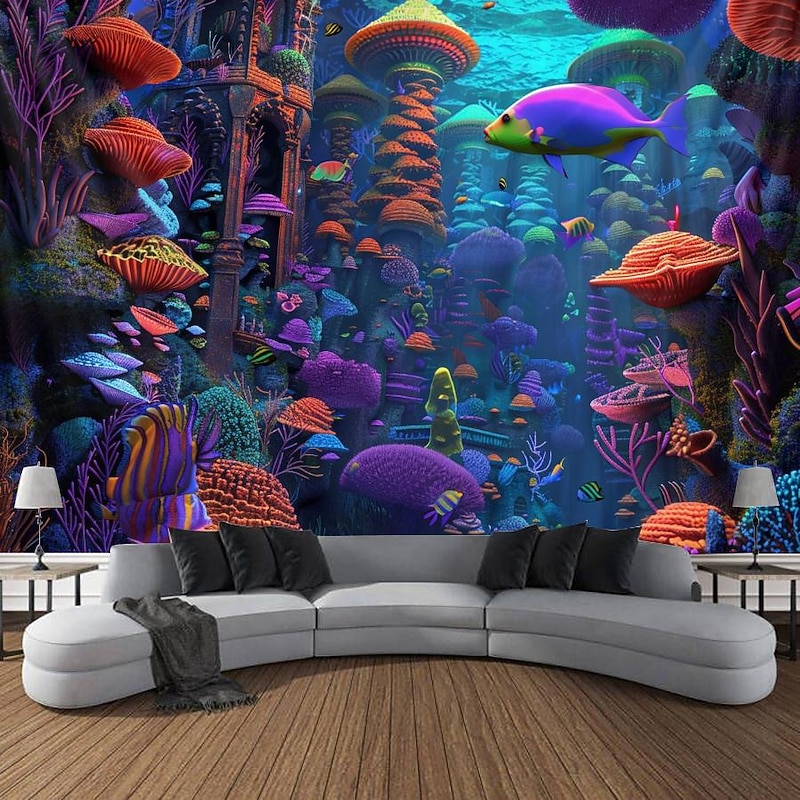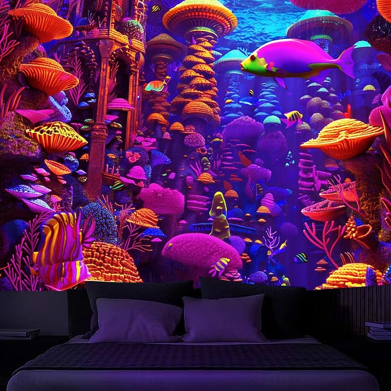 HOT ! Blacklight Tapestry UV Reactive Glow in the Dark Glow Party Neon Jellyfish Fantasy Undersea Nature Psychedelic Trippy Misty Hanging Tapestry Wall Art Mural for Living Room Bedroom