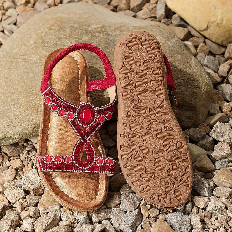 Highlights [Fabric] Crafted from premium microbial leather, these sandals provide a smooth and breathable feel, perfect for summer outings. The durable rubber outsole ensures a comfortable and stable experience on any surface. [Fit] Designed with a flat heel, these sandals offer an effortless blend of comfort and style, ideal for all-day wear during vacations or beach trips. [Design Highlights] These elegant sandals feature intricate embellishments, including sparkling rhinestones and imitation pearls, that create an eye-catching pattern. The vibrant red straps add a bold touch, and the elasticized band provides a snug and flexible fit for enhanced comfort. [Occasions] Ideal for vacation getaways, beach adventures, or casual outings, these sandals perfectly complement your bohemian and chic style. They add a touch of glamour to any warm-weather ensemble. [Size Availability] Available in a variety of colors including Brown, Black, Silver, Red, and Blue, these sandals come in sizes ranging from US5 / EU35 / UK3 to US12 / EU42 / UK10, accommodating a wide range of preferences and ensuring a perfect fit for every wearer.