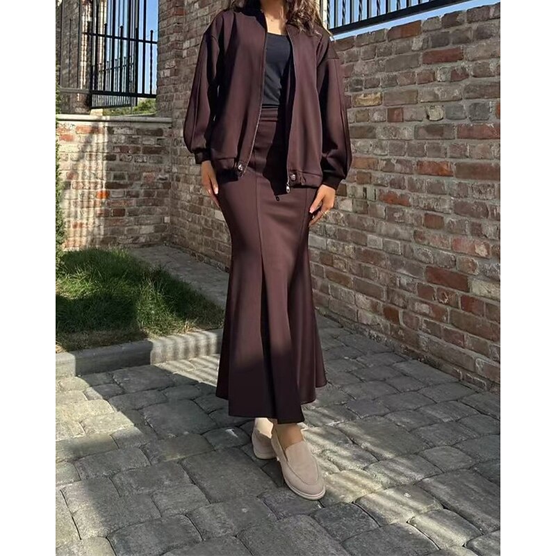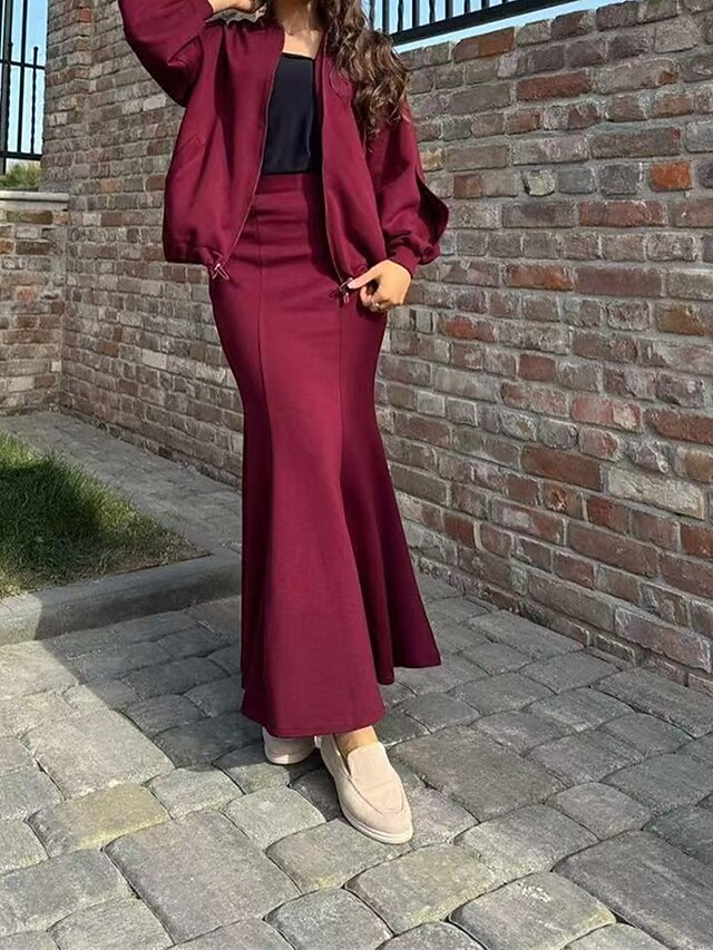 Women's Dress Set Summer Dress Midi Dress Casual Plain Zipper Maxi Dress Long Sleeve V Neck Outdoor Date Black Wine Coffee Summer Loose Fit 2