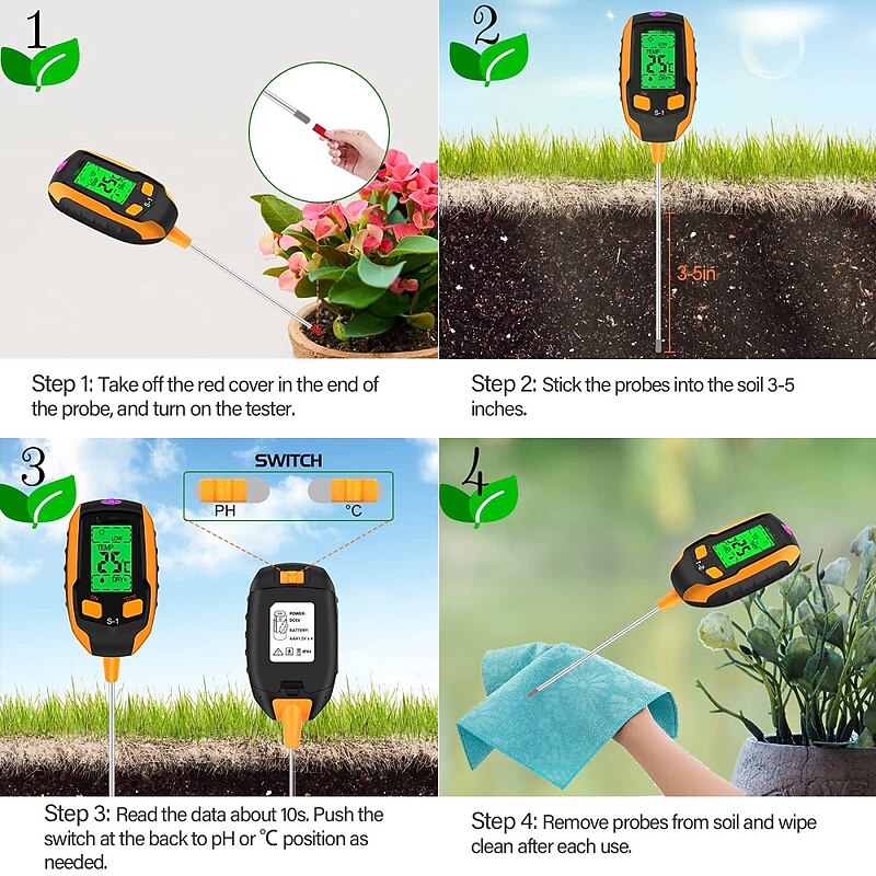 - Easy to Use: Simply insert the probe about 4 inches into soil, wait 10 seconds for the readings, and you'll get accurate and precise information immediately. Remove the probe and wipe it clean after use.