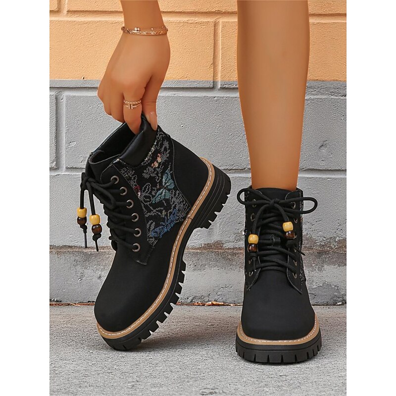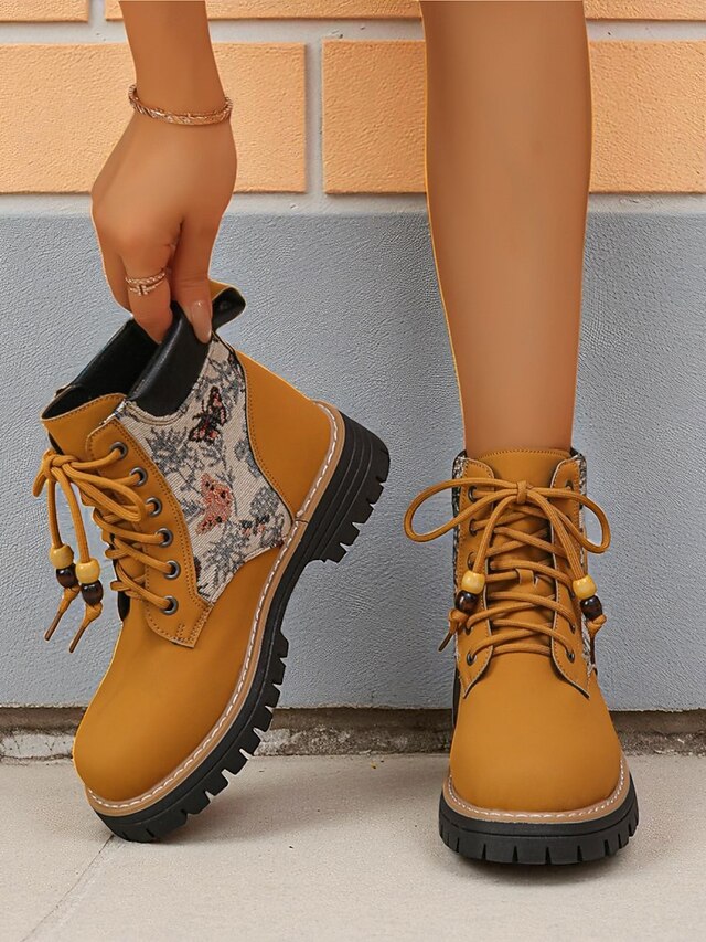 HOT ! Women's Yellow Lace-Up Ankle Boots with Jacquard Fabric Panels – Fashion Hiking Style Shoes for Autumn, Winter & Outdoor Casual Outfits