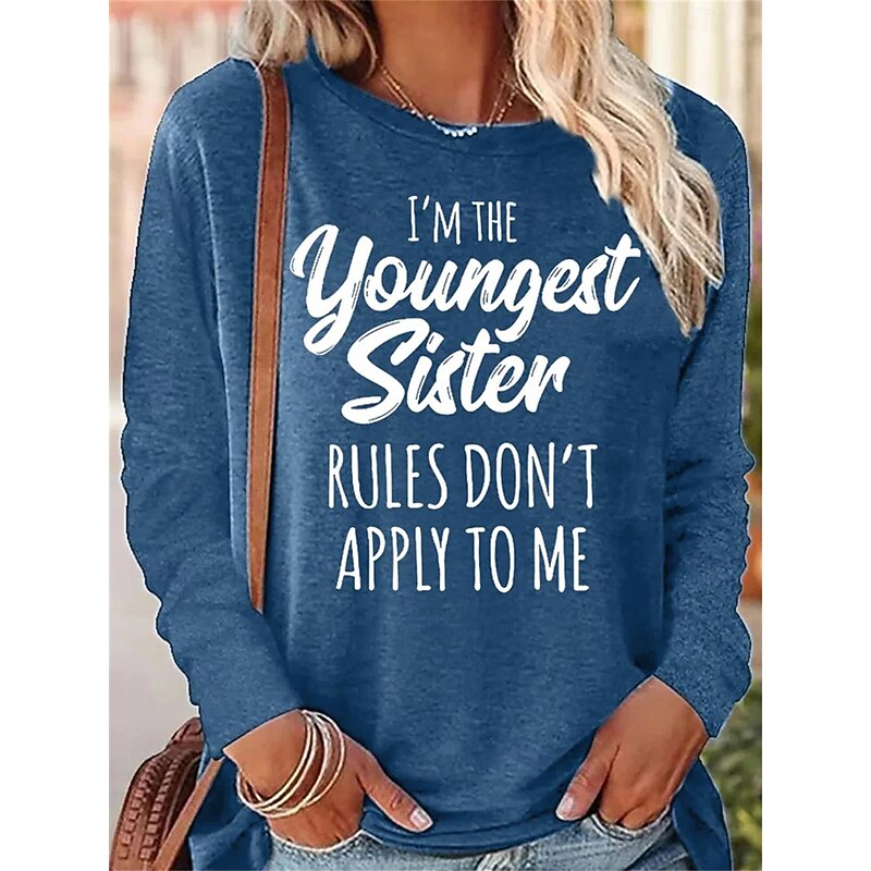 : Adorned with a playful letter print, "I'm the Youngest Sister, Rules Don't Apply to Me," this T-shirt adds a humorous and trendy touch to your outfit. The print is done using hot stamping, ensuring vibrant and lasting color.