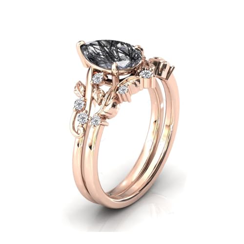Natural Pear Black Rutilated Quartz Engagement Ring Set 925 Sterling Silver Rings for Her with Free Engraving Jewelry Gift for Women Black Rutilated Quartz Vintage Ring Set Size 5