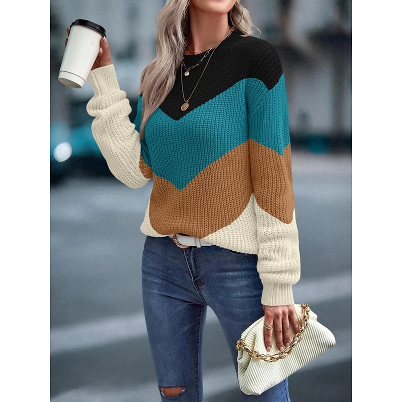 : This color-block sweater showcases a bold chevron pattern in rich hues of black, teal, mustard, and cream. The crew neckline and ribbed cuffs provide a structured classic touch, while the sweater’s relaxed fit offers a modern, casual vibe.