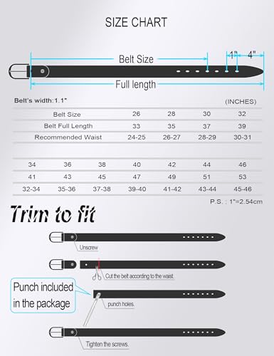 • [Perfect Fit]: Crafted with seven reinforced holes, this genuine leather belt effortlessly adapts to various waist sizes. To optimize comfort, explore our sizing chart for your perfect fit. Additionally, every leather belt includes a puncher for easy adjustments whenever needed.