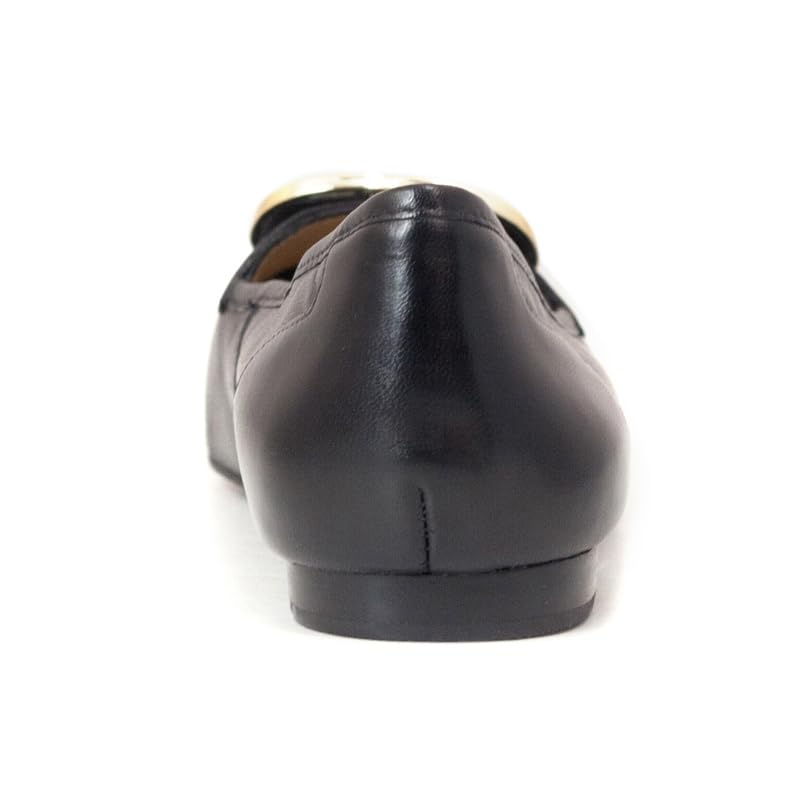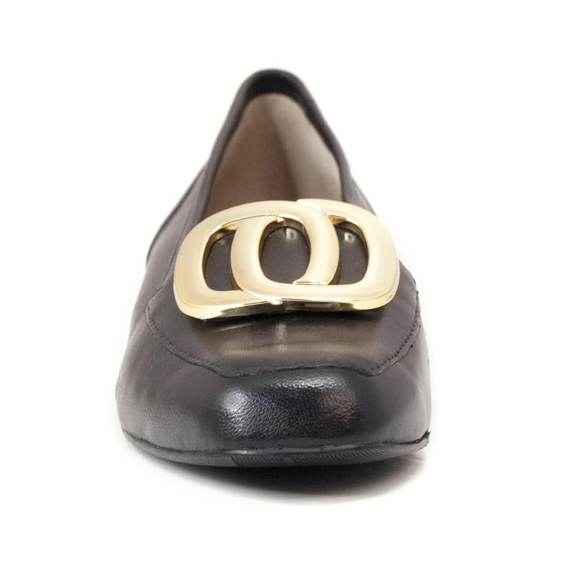 • ELEGANT DESIGN: Classic black leather ballet flats featuring a distinctive gold double-ring buckle accent on the square toe for sophisticated style