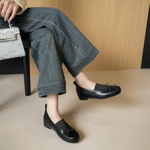 Women's Leather Bow Closed Round Toe Flats Elegant Elastic Slip On Comfortable Soft Sole Inner Heighten Dress Ballerina Flats Work Office Causal Non-Slip Walking Shoes 6