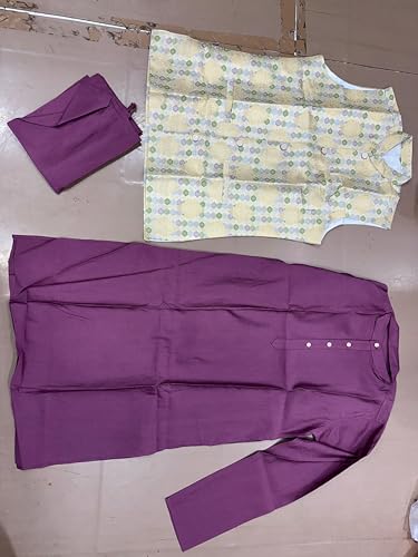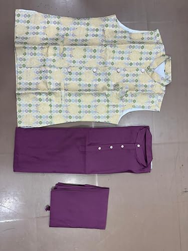 • Koti (Jacket) Fabric: Premium Jacquard with inner lining and fusing for a structured, elegant look // Kurta & Pajama Fabric: Smooth Roman Silk that offers a rich texture and comfortable fit // Set Includes: 1 Jacquard Nehru Jacket, 1 Roman Silk Kurta, and 1 Roman Silk Pajama // Design: Traditional ethnic set with a modern silhouette, suitable for weddings, festivals, receptions, and special occasions // Fit Type: Ready-to-wear stitched set for ease, comfort, and confident style